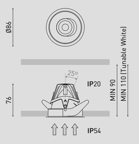 The sophistication of recessed lighting. Buddy is here to maximise the luminous performance of the classic recessed luminaire. It emerges with a solid and purposeful design, greater energy savings and excellent visual comfort. The product family comes in several versions with four opening angles "flood, medium, spot and super spot". The dim to warm technology enables Buddy to facilitate comfort to the space by dimming the intensity and colour temperature. Furthermore, with the tunable White feature it can be controlled independently. Its four versions per position demonstrate its versatility: recessed, trimless, tilt and the tilt trimless version, which maintains its light output at all opening angles.
