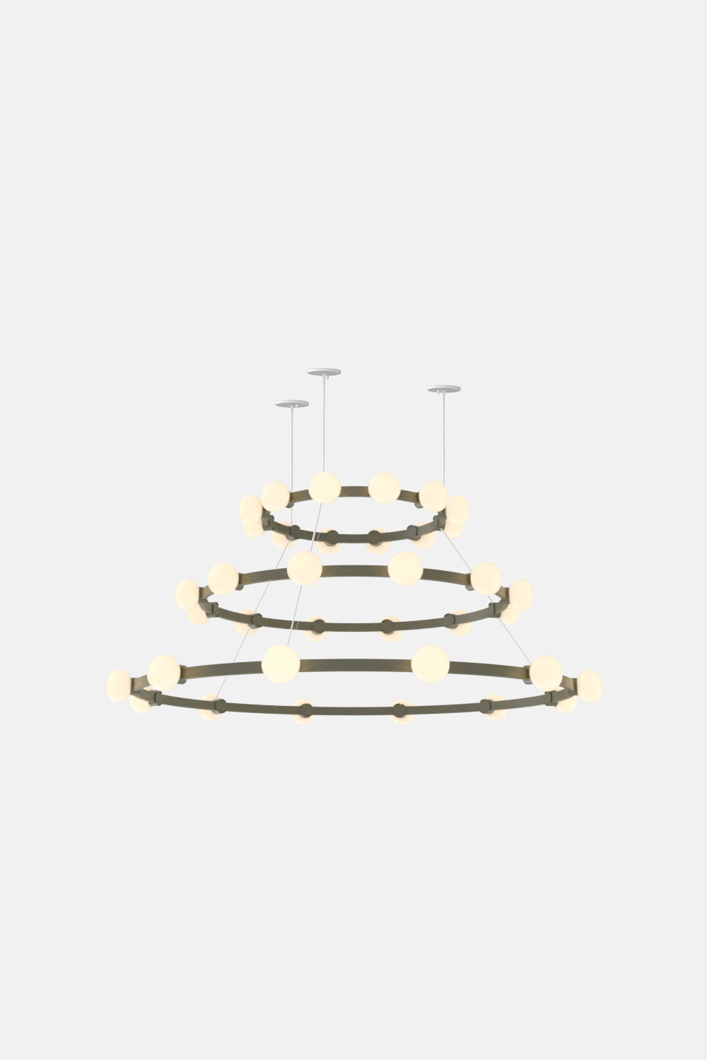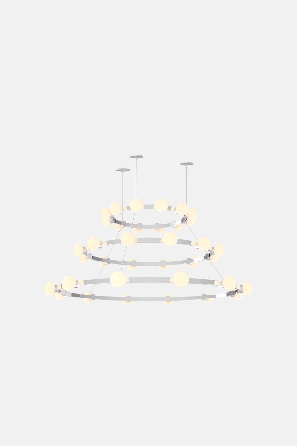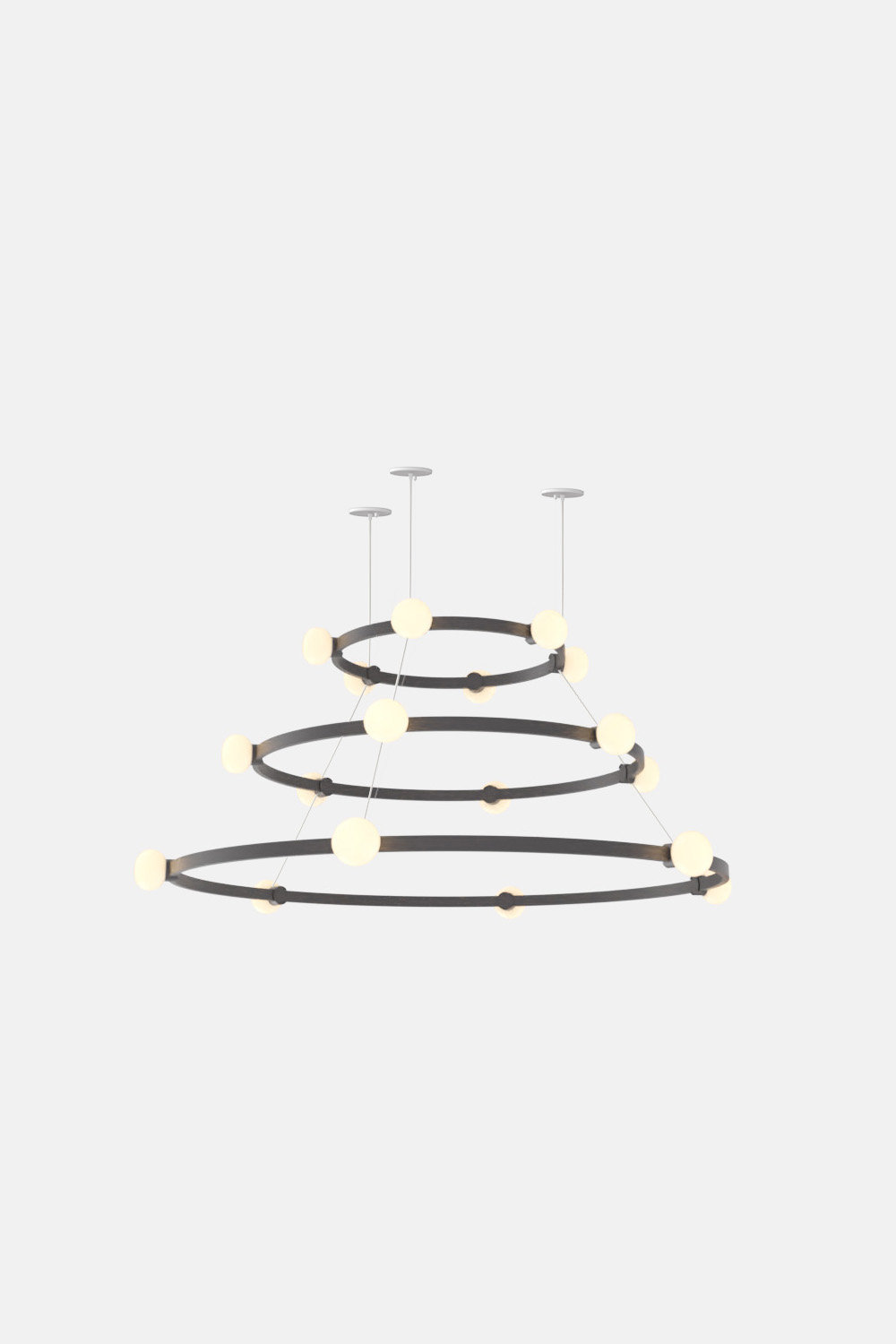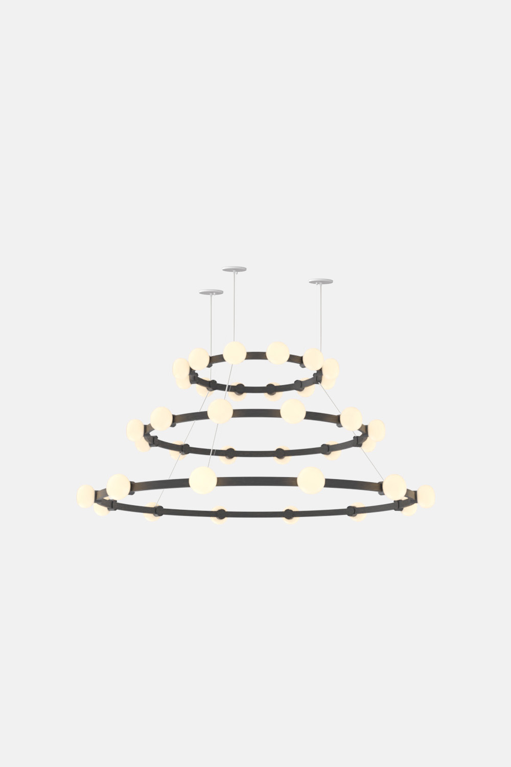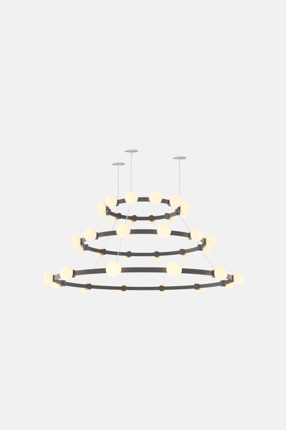 The Cinema Chandelier makes a bold statement with minimal effort, featuring a simple circular frame in a rich metal or powder coated finish embellished by the warm glow of opal glass fixtures. Evocative of Old Hollywood’s charm, Cinema’s theatrical features are customizable to various compositions: The rings are available in stackable four-, six- or eight-foot diameters.