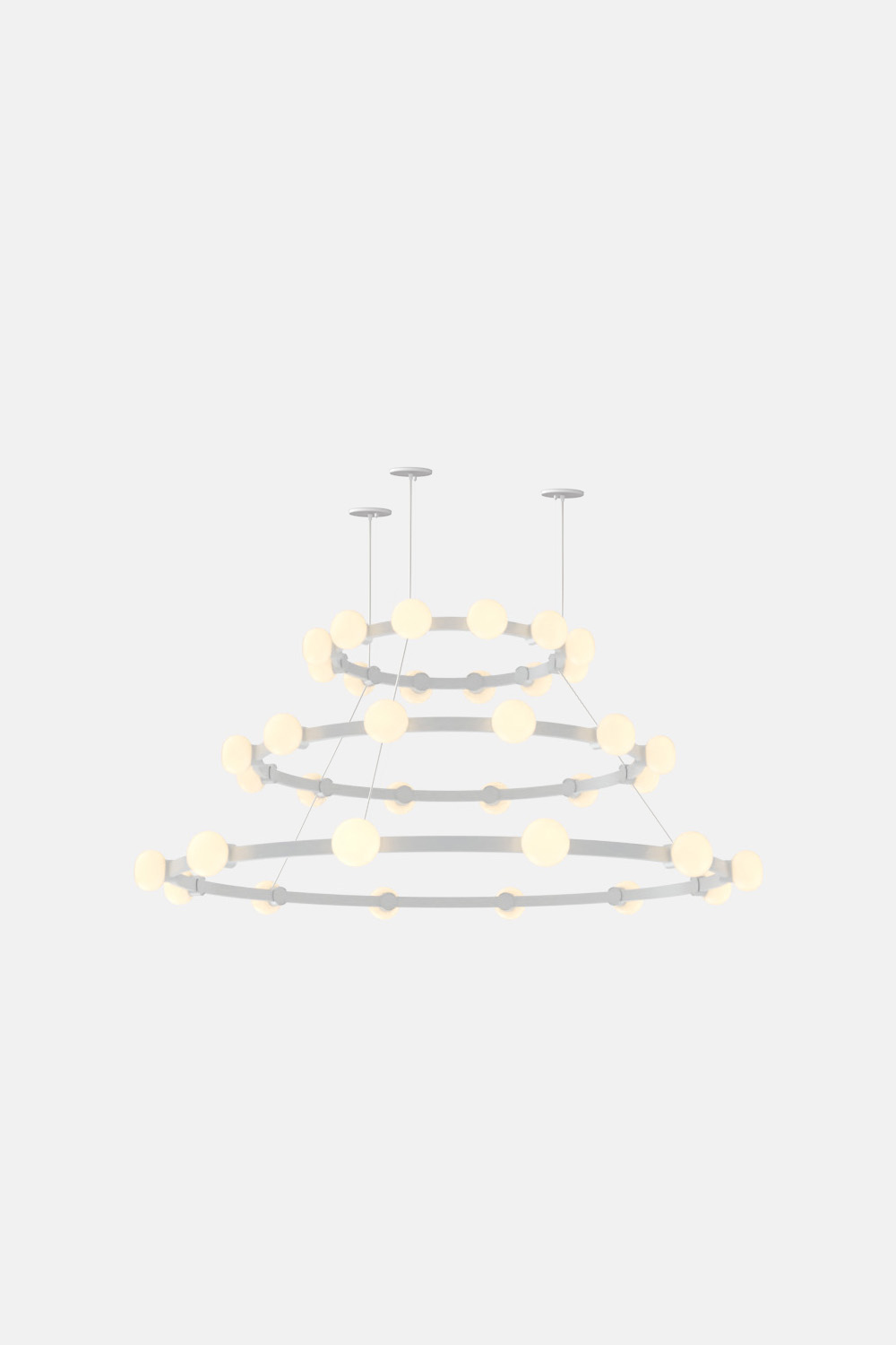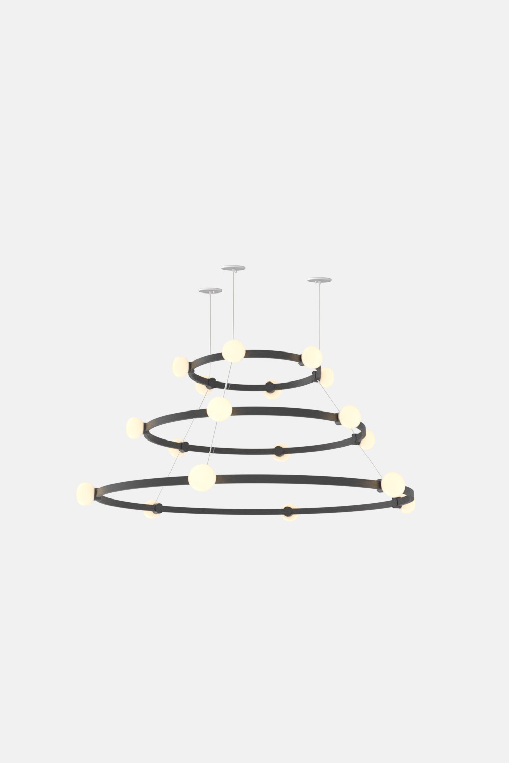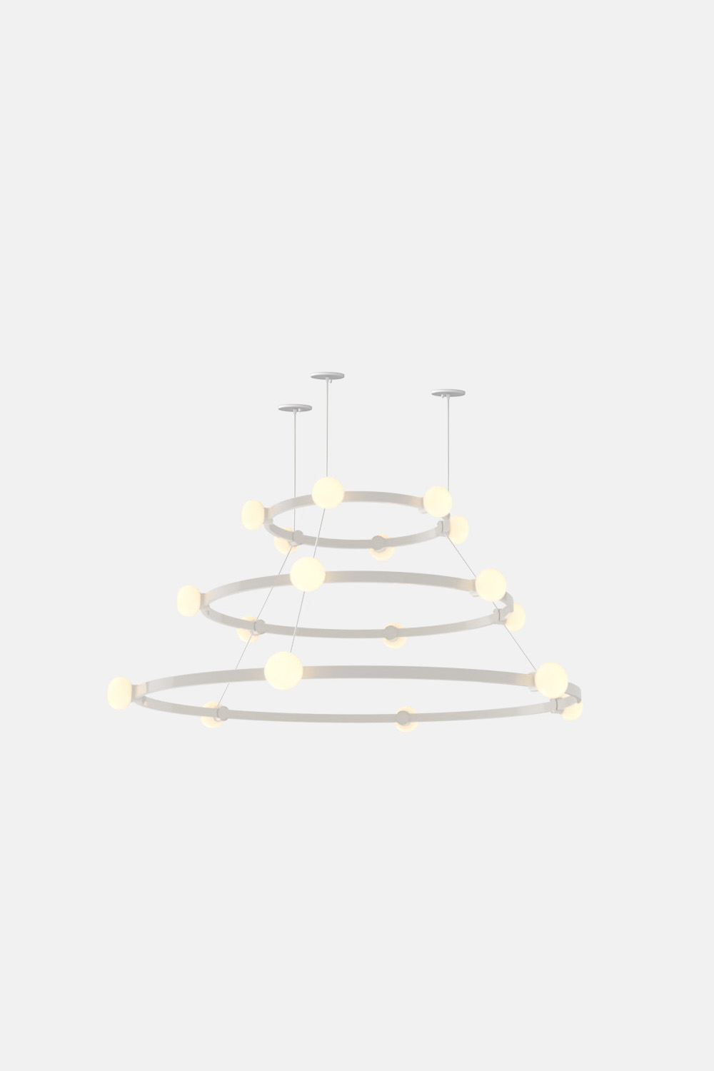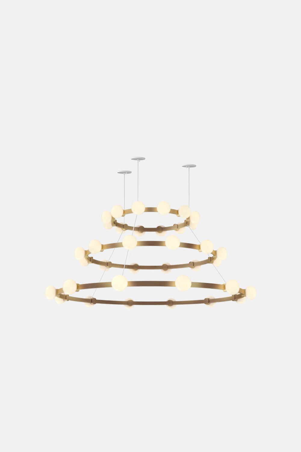 The Cinema Chandelier makes a bold statement with minimal effort, featuring a simple circular frame in a rich metal or powder coated finish embellished by the warm glow of opal glass fixtures. Evocative of Old Hollywood’s charm, Cinema’s theatrical features are customizable to various compositions: The rings are available in stackable four-, six- or eight-foot diameters.