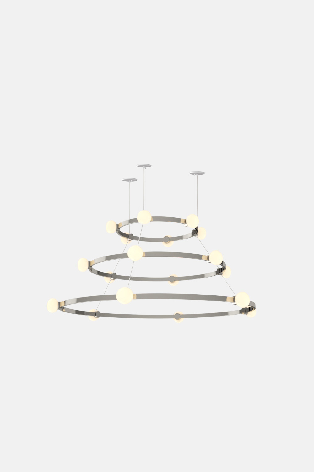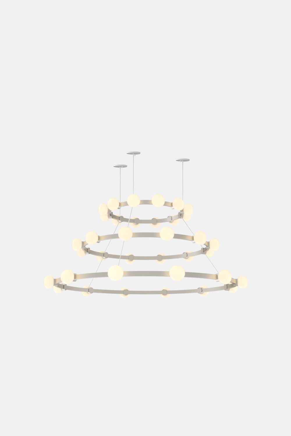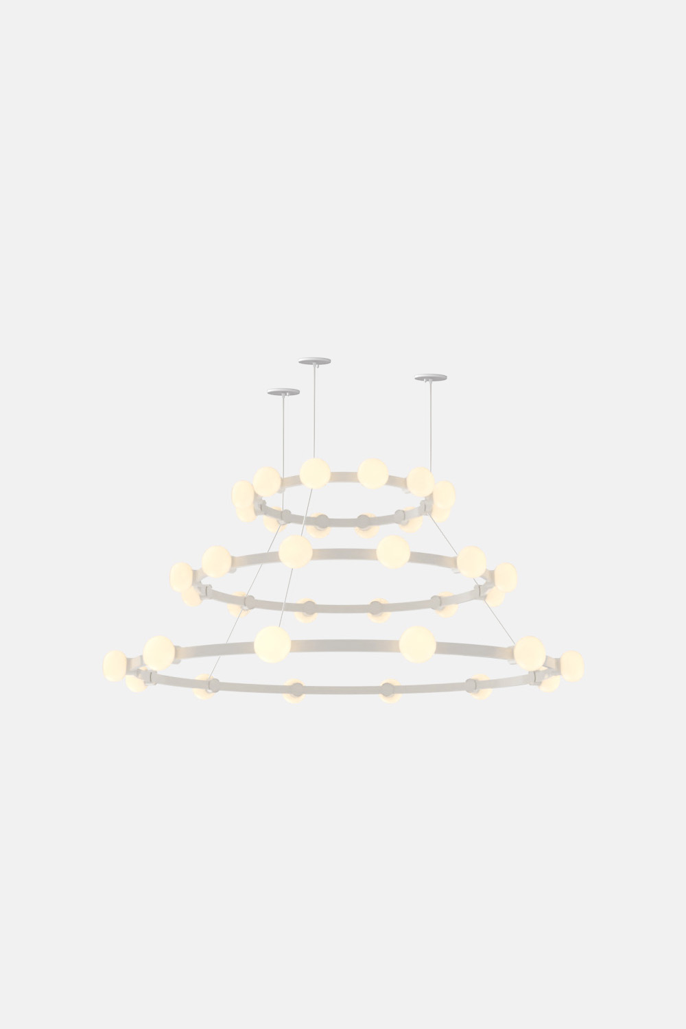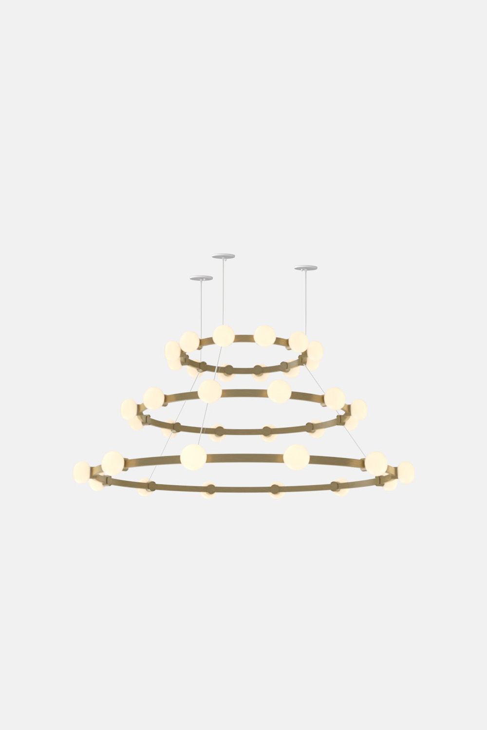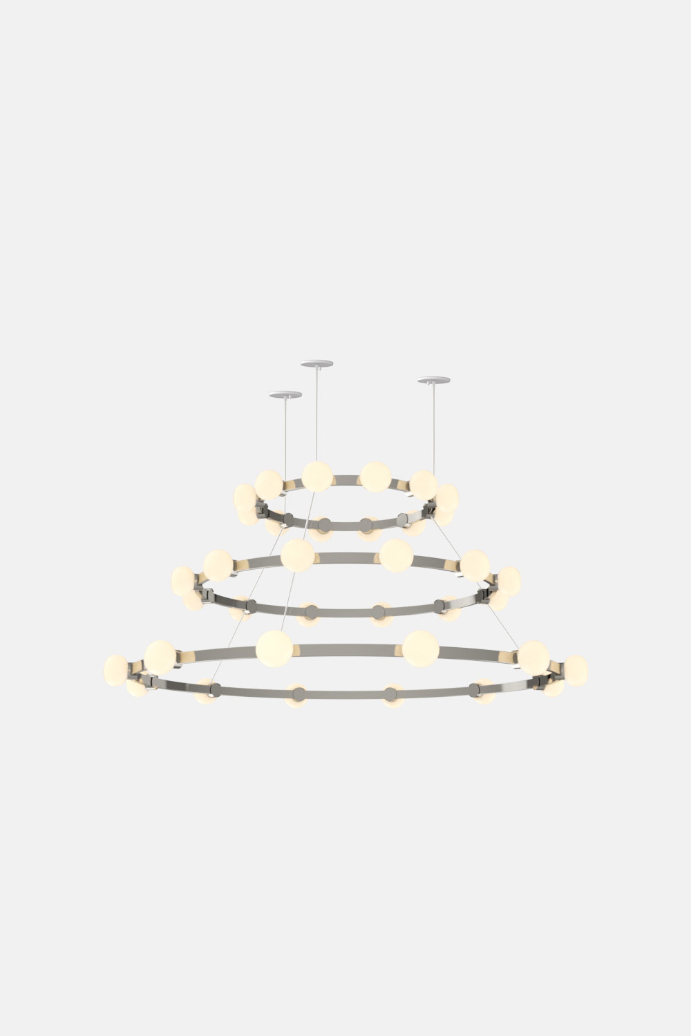 The Cinema Chandelier makes a bold statement with minimal effort, featuring a simple circular frame in a rich metal or powder coated finish embellished by the warm glow of opal glass fixtures. Evocative of Old Hollywood’s charm, Cinema’s theatrical features are customizable to various compositions: The rings are available in stackable four-, six- or eight-foot diameters.