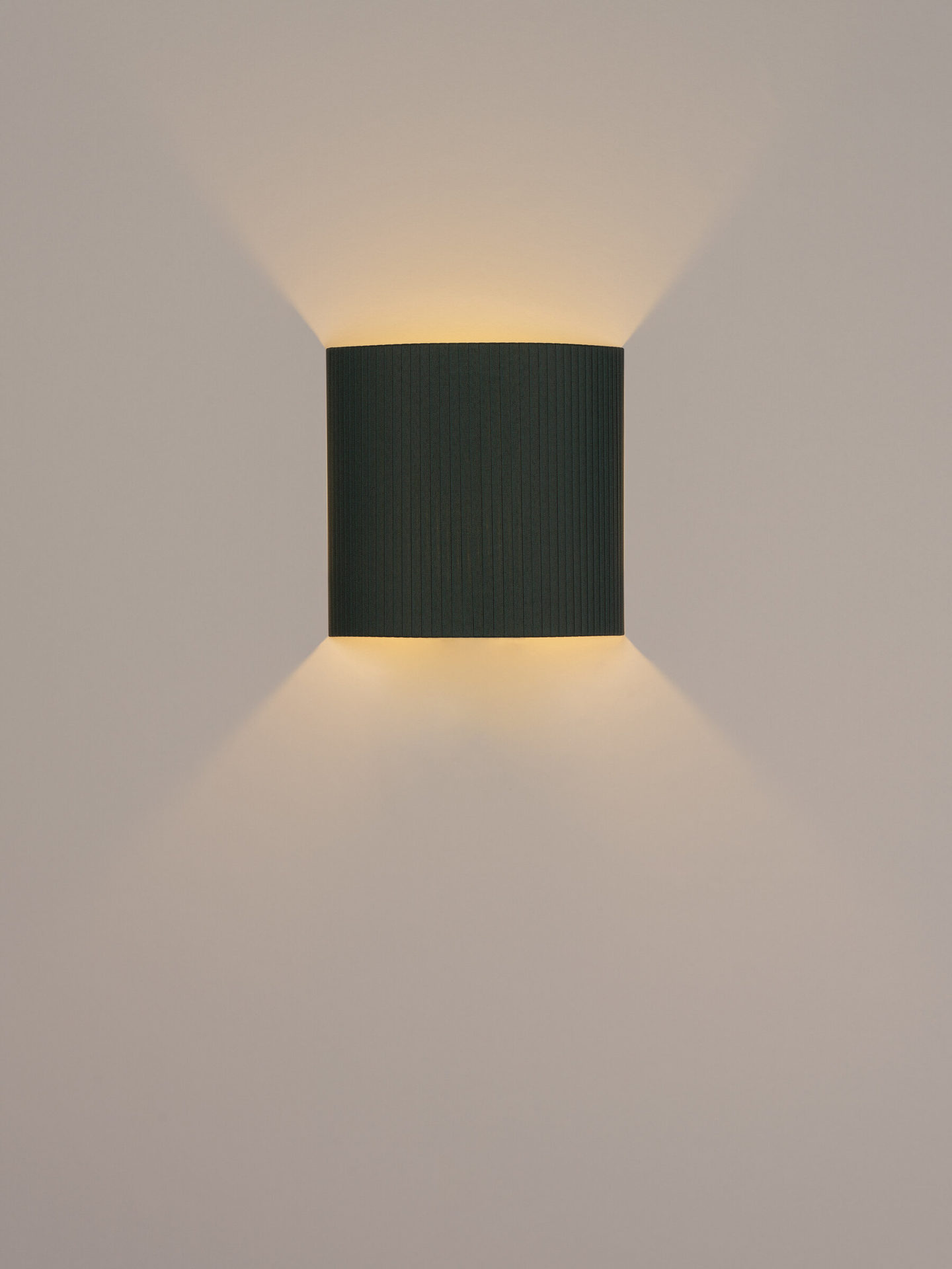This minimalist wall lamp humanises neutral spaces with its colourful and functional sobriety. The shade is fondly hand-ribboned, piece by piece. Switched on, it provides a characteristic warm light, rich in nuances, and switched off, it is a small, volumetric sculpture that invites immediate use. The shape of its shade conceals the light source from sideways view.