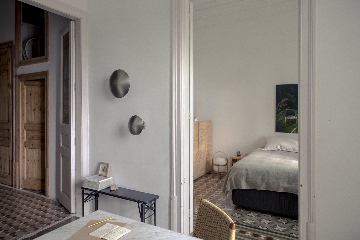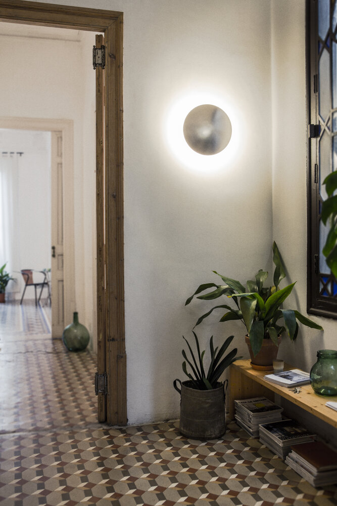 Reminiscent of the stars during an eclipse, the light reflected on the wall creates a pleasant halo. The Disco wall lamp consists of a metal disc that hides a LED light source, diffusing the light around the opaque circle.