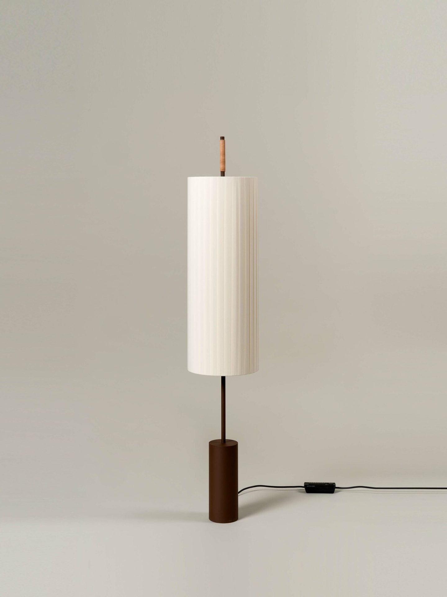 A delicate hand-made ribbon shade is offset by a sturdy dark brown cylindrical base. The lamp stem is topped by a natural leather grip for a rustic feel. Reminiscent of humanity's oldest Greek columns, Dórica is a symbol of strength. An optional, wider stabilising base is also available for use in busy areas. Jordi Miralbell and Mariona Raventós were a pair of design artisans who created different pieces of lighting and furniture, and tackled numerous projects together; amongst others, they were editors and partners at Santa & Cole. The poetic shapes of their lamps, crafted in materials such as parchment, raffia or cotton, offer different ways of lighting that reflect the essence of the creative duo: \x93Design is the art of transforming the utilitarian into an object of desire, made with human warmth.\x94 Dórica is a radiant sculpture of light. A classic allegory by one of Barcelona's most famous designer duo of the end of the century. A manifesto of the importance of industrial craftsmanship as the only way to offer the best user experience.
