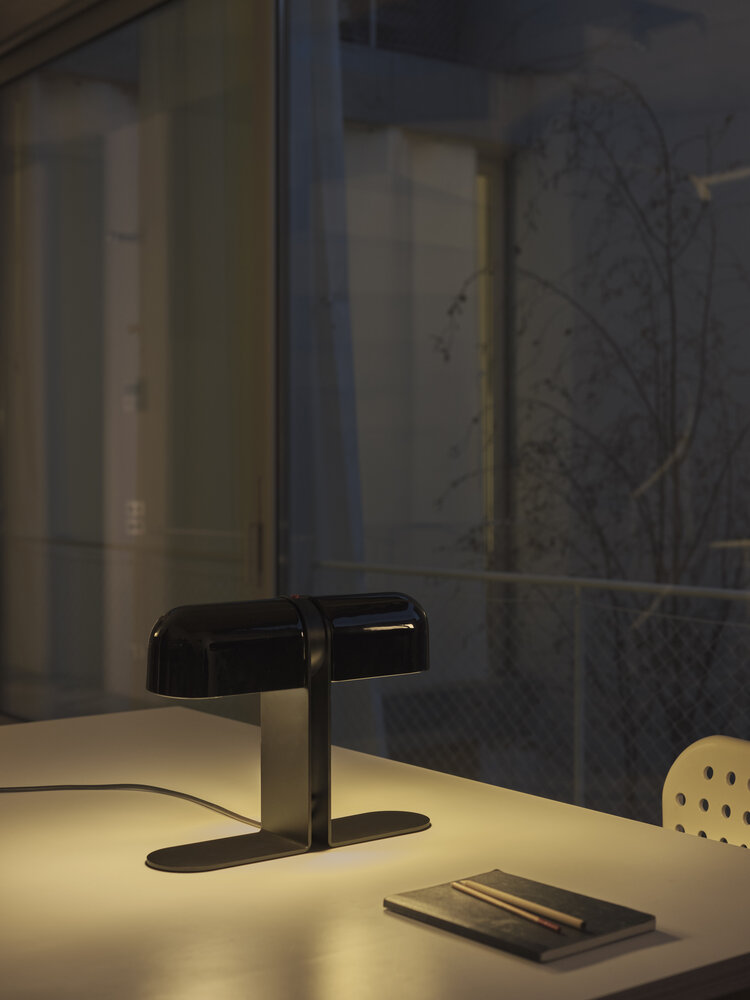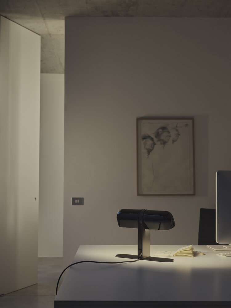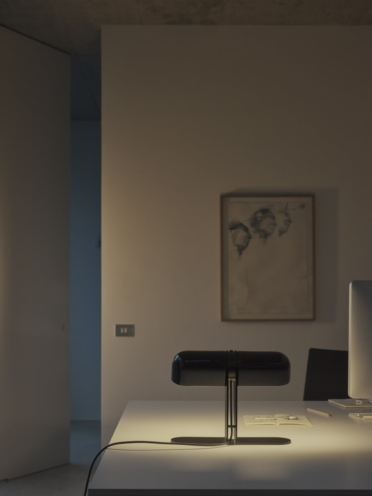 The Duo lamp was conceived by André Ricard for “executive desks”, not only that good focal light was required when going through extensive paperwork, but also the fact that, in the face of visitors, the view of those who sat in the confidants’ chairs should not be obstructed by a large or ostentatious lampshade. Duo fulfils both purposes seamlessly. It illuminates with proximity, and does not interrupt the visual horizon.