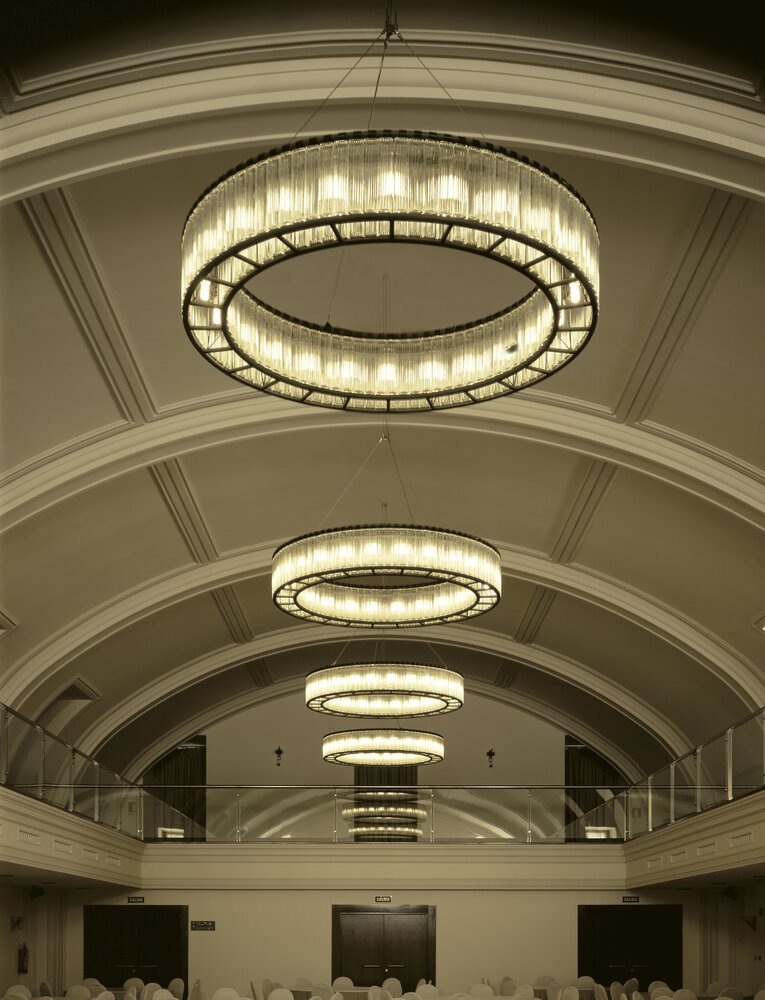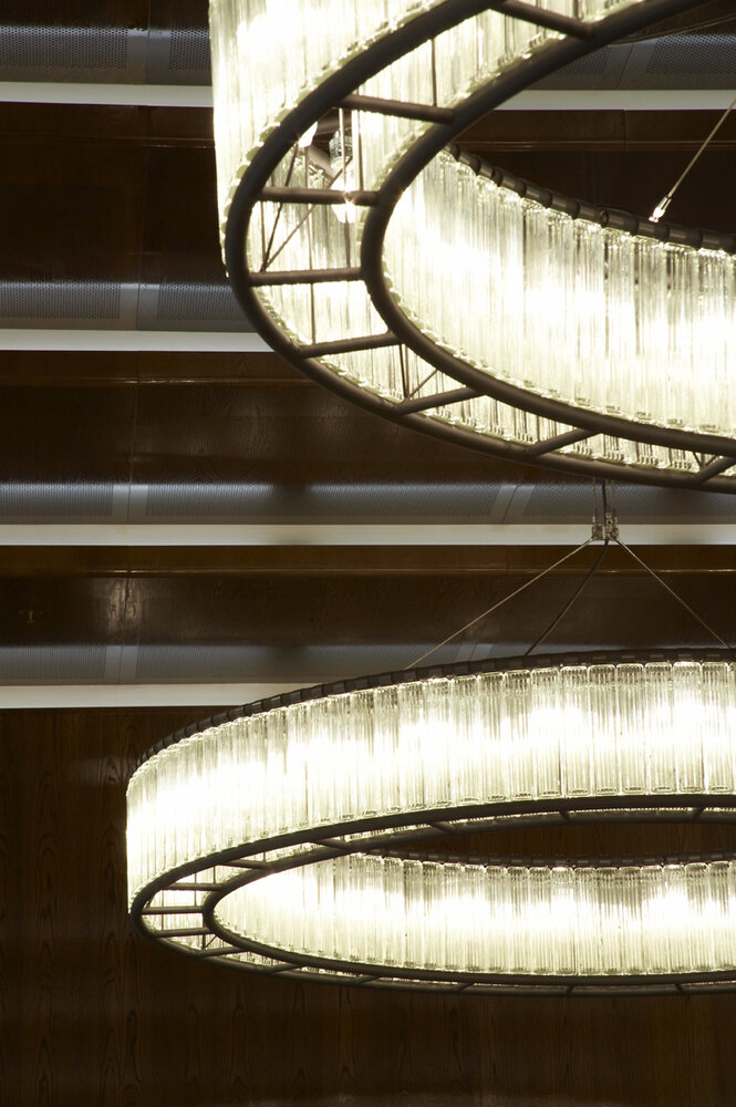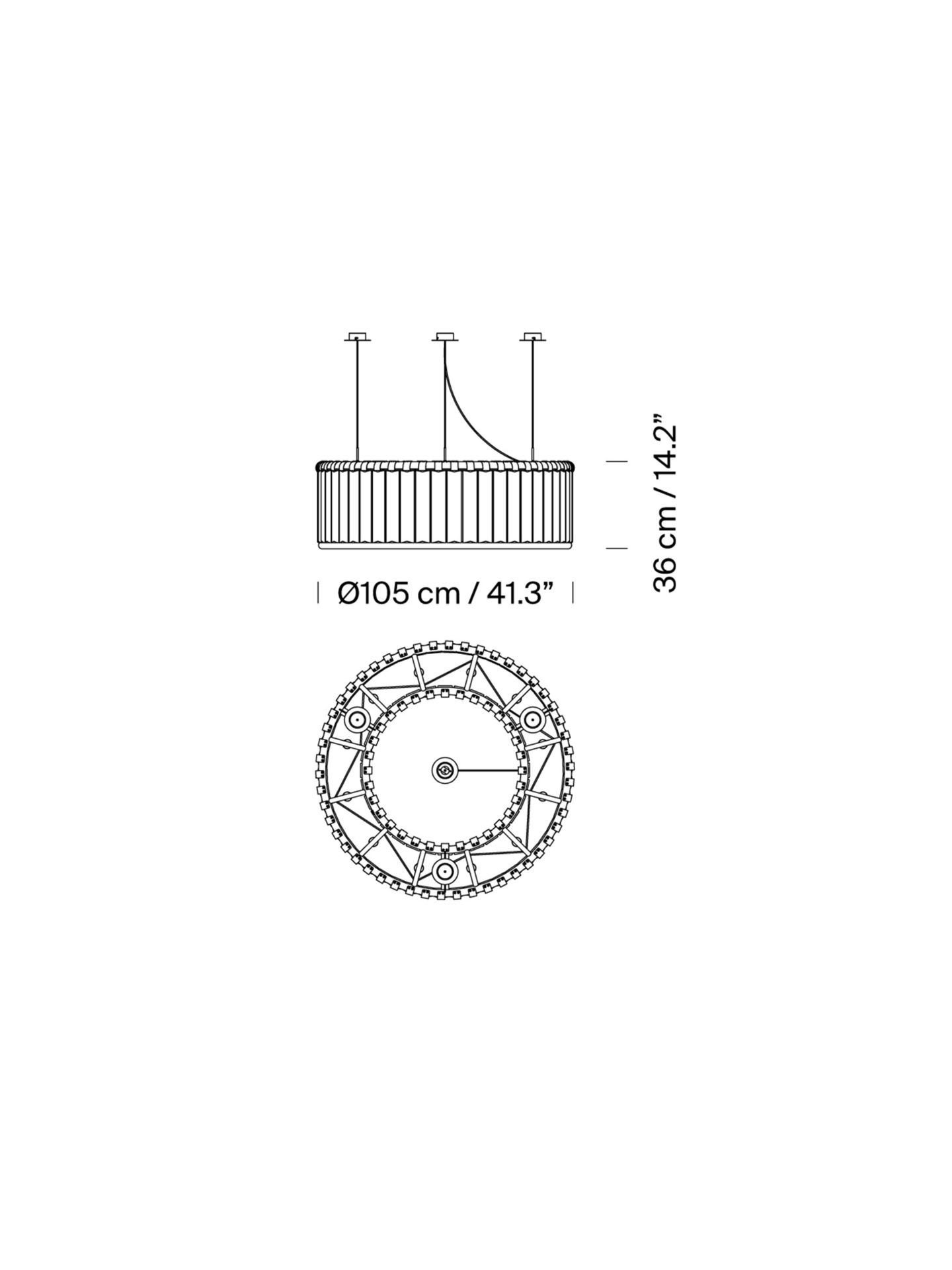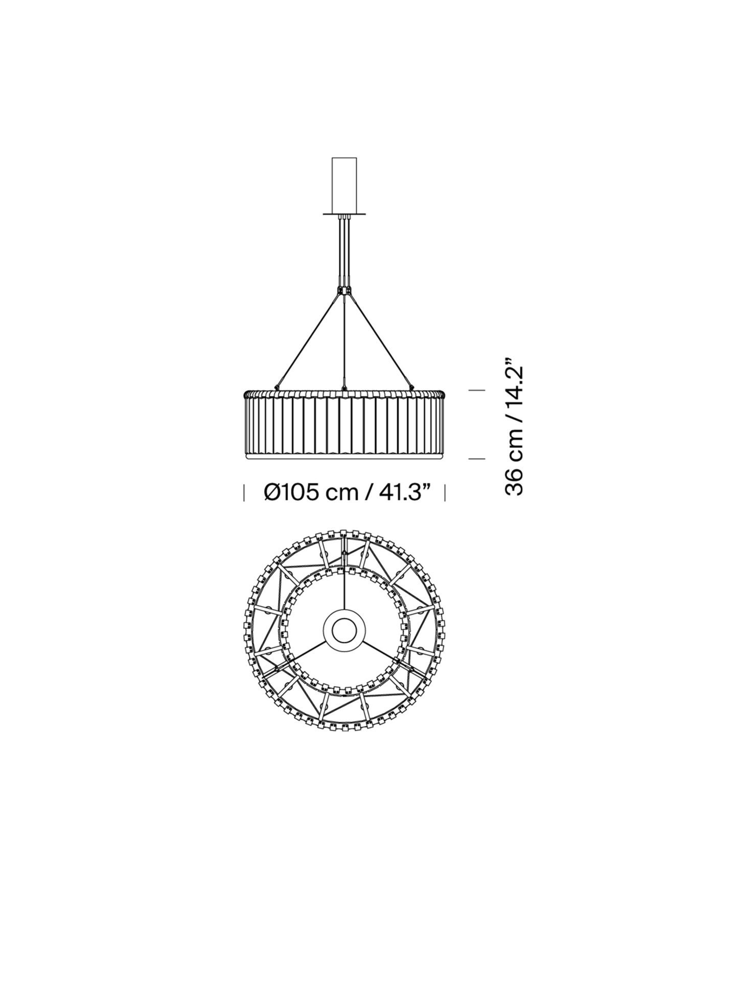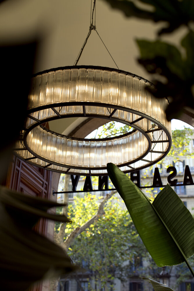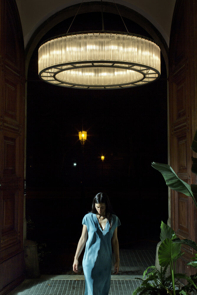 Originally designed for the 1992 Olympic Games in Barcelona, this elegant crown of light ennobles a public space. Conceptually, it is reminiscent of the huge cast iron chandeliers with a sequence of candles often seen in medieval castles and cathedrals. The frame is a tubular structure the visible sides of which are made of sections of glass blocks.