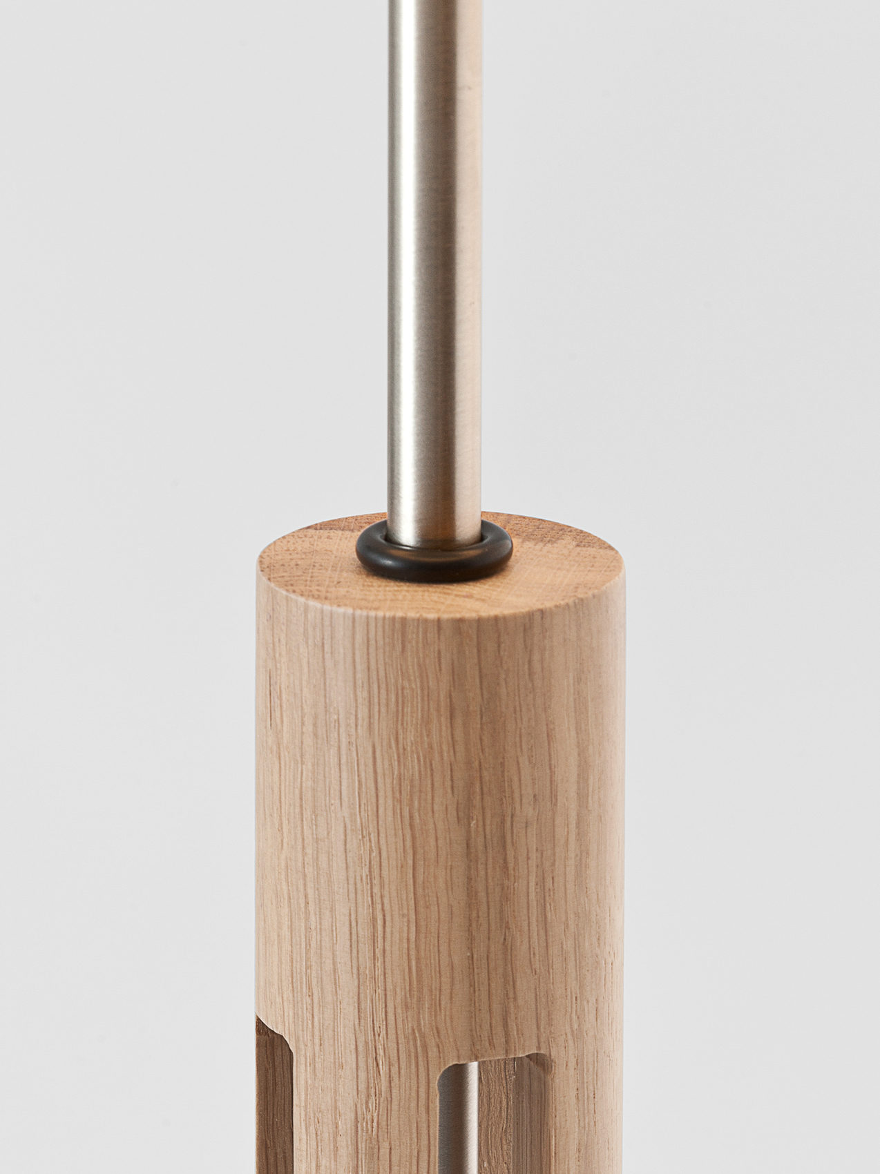 Miguel Milá got everything right compositionally with this demonstration of industrial craftsmanship. Its cylindrical oak column creates a vertical symmetry that gracefully supports an almost cylindrical white linen shade. With no time for unnecessary adornment, FAD lamps are distinguished by their permanent elegance.