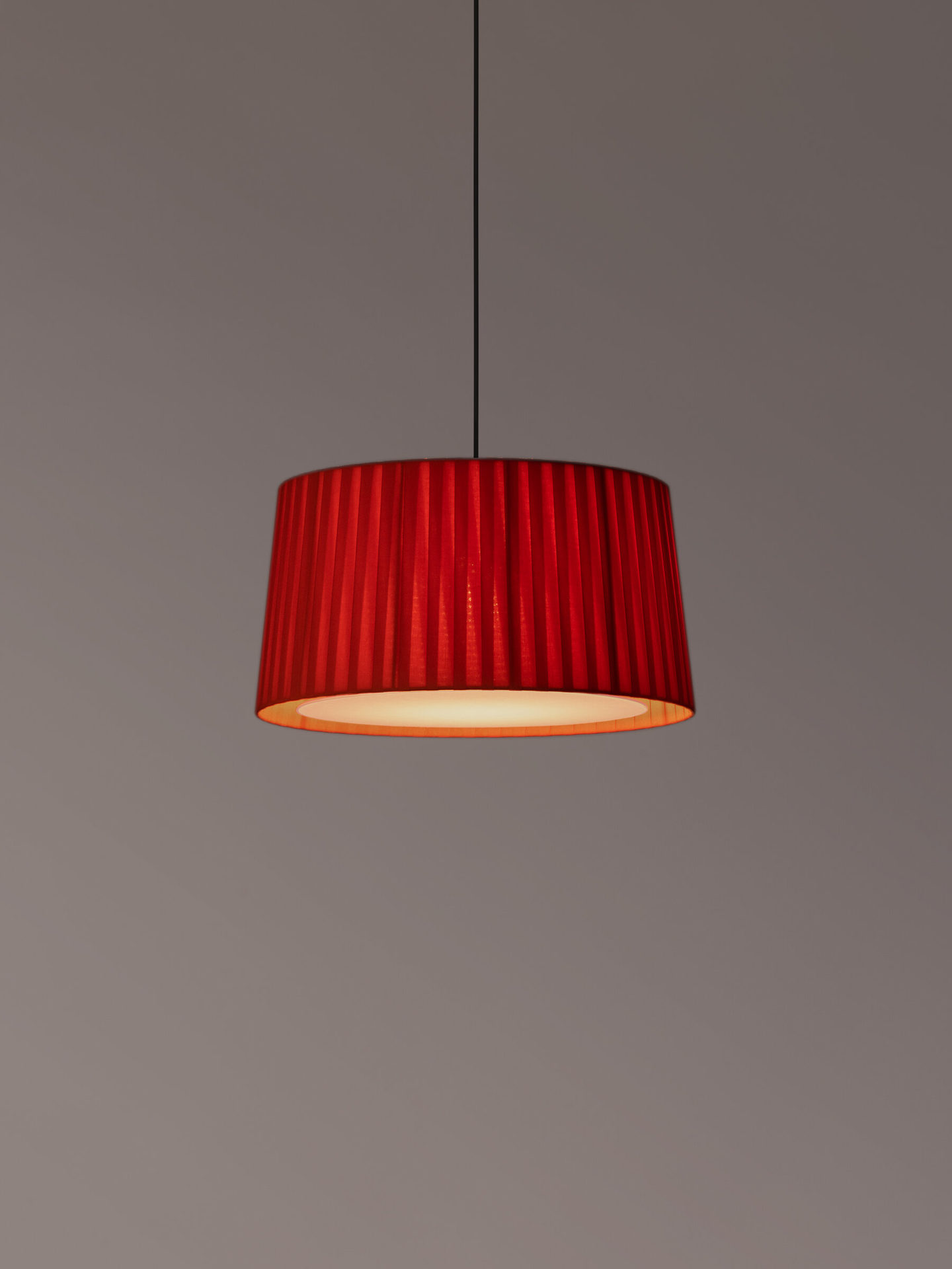 Designed for intermediate volumes and household areas, GT5 and GT6 are hanging lamps with ribboned shades whose mere presence imbues a room with character. Santa & Cole advocates the use of ribboned shades to dress up every kind of light source, exploring different materials and playing with colours and hues.
