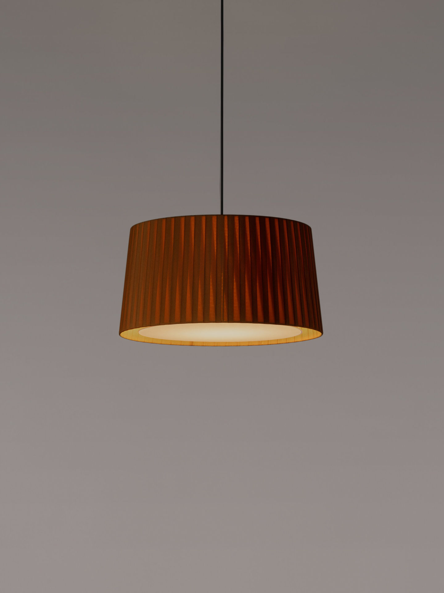 Designed for intermediate volumes and household areas, GT5 and GT6 are hanging lamps with ribboned shades whose mere presence imbues a room with character. Santa & Cole advocates the use of ribboned shades to dress up every kind of light source, exploring different materials and playing with colours and hues.