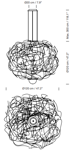 The Liceo pendant light creates a dramatic glow reminiscent of a ball of fire, that lends sumptuous elegance to the most prestigious venues. The lamp was designed in 1999 for the restoration of the Liceo, Barcelona's grand opera theatre that was engulfed in flames in 1994, and merely the walls of 1847 remained standing. A hollow bronze mesh shade, creased by hand, is attached to a steel shaft and incorporates a large source of light at the bottom, which casts plenty of indirect light upwards.