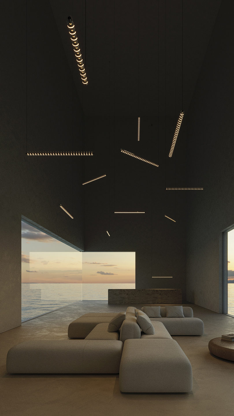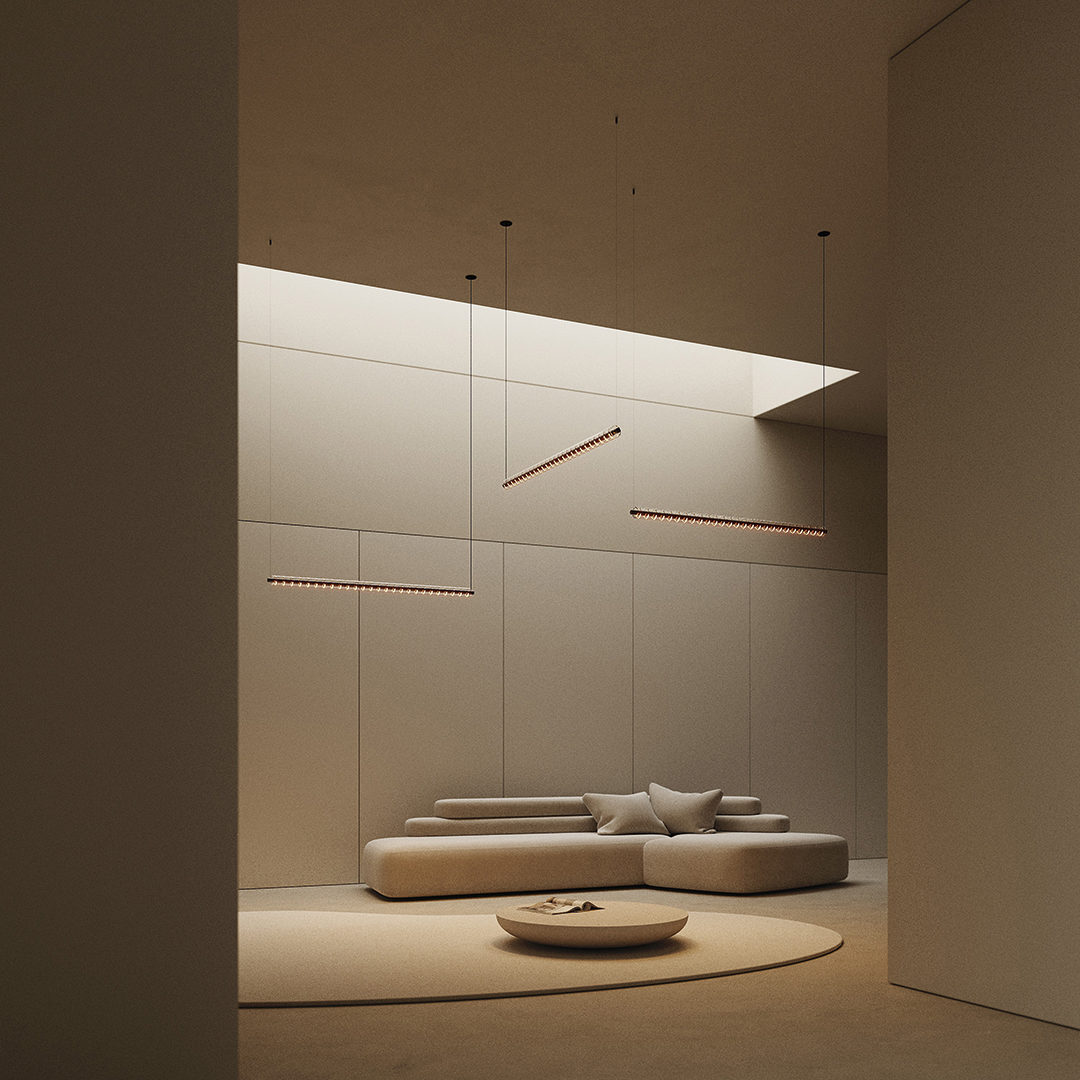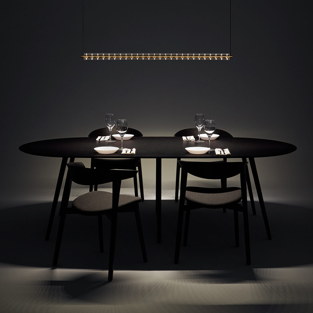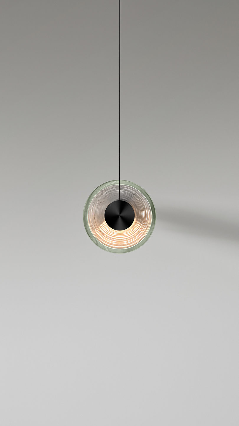 Daring and fanciful, Loop appeals to industrial lyricism with a design inspired by electrical insulators. The protagonist of the decoration, its body is a sequence of light disks with an aluminium interior. It's adorned by a suspended glass cylinder that acts as a fastflowing, controlled source of projected light.