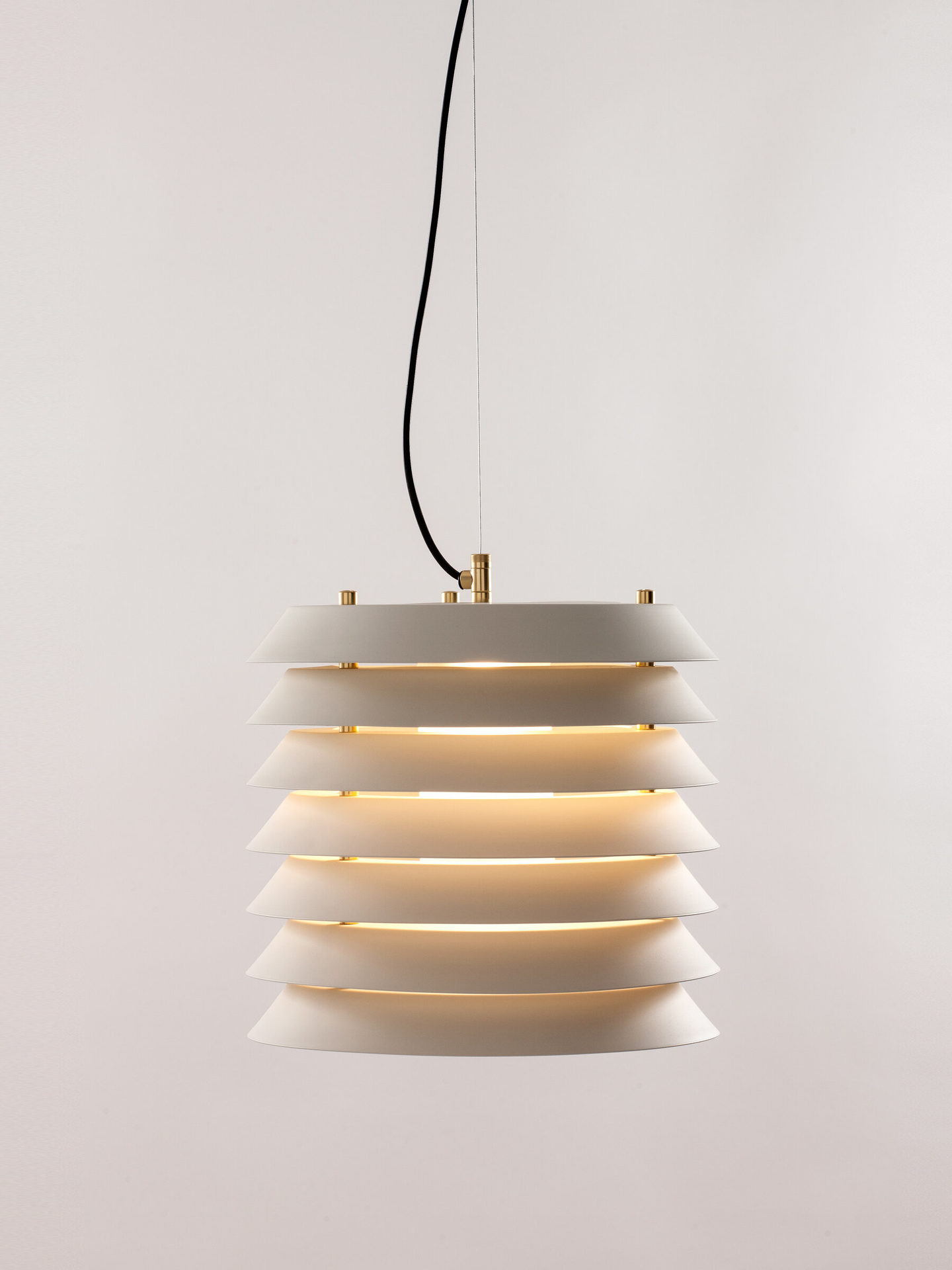 Maija conveys the feeling of light typical of Baltic cities, where the streets are barely illuminated, apart from the light that streams from the windows of homes and shops; from the inside outwards. A tower composed of stacked metal discs through which its inner light filters, vibrant and inviting conversation.