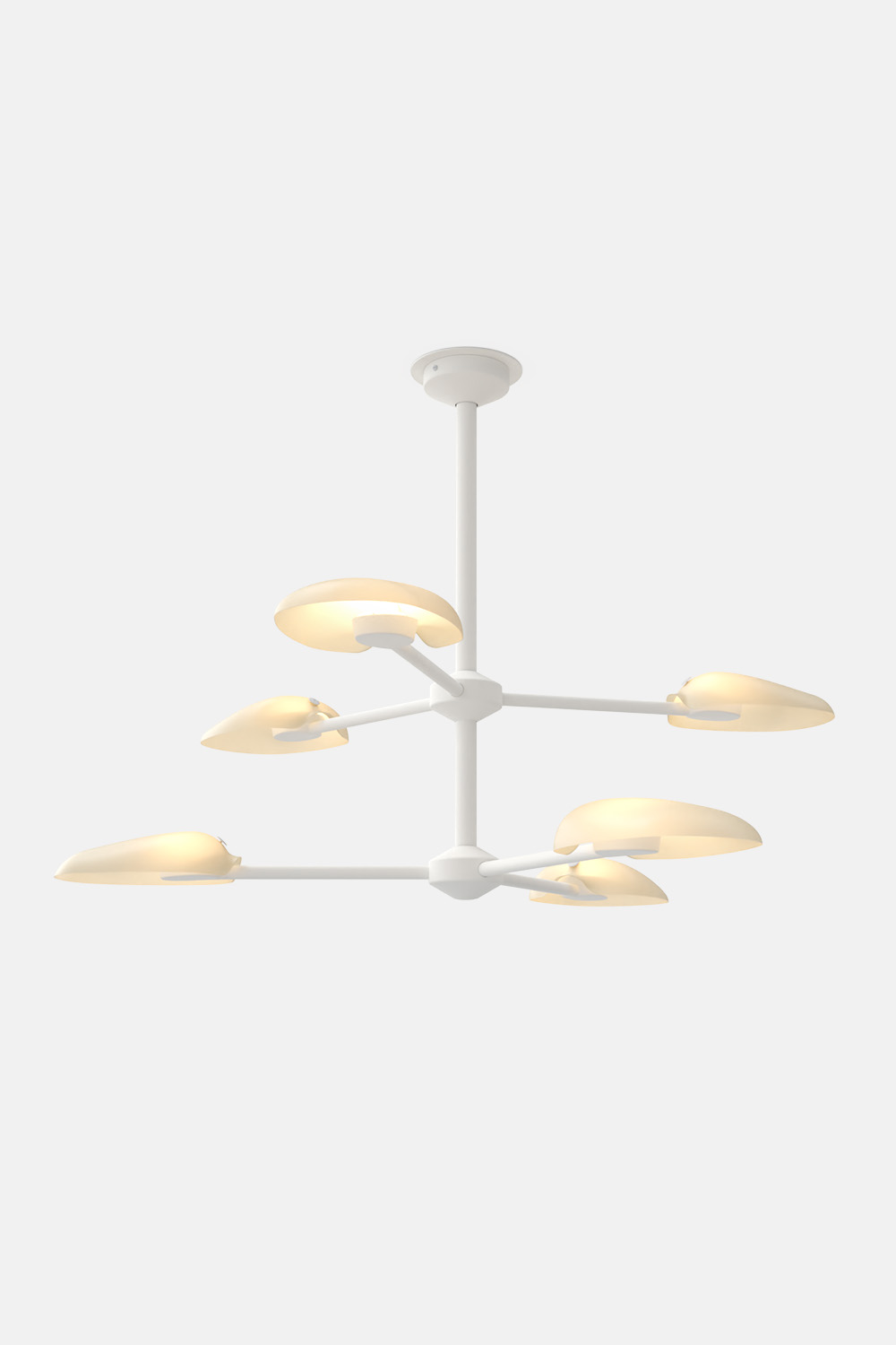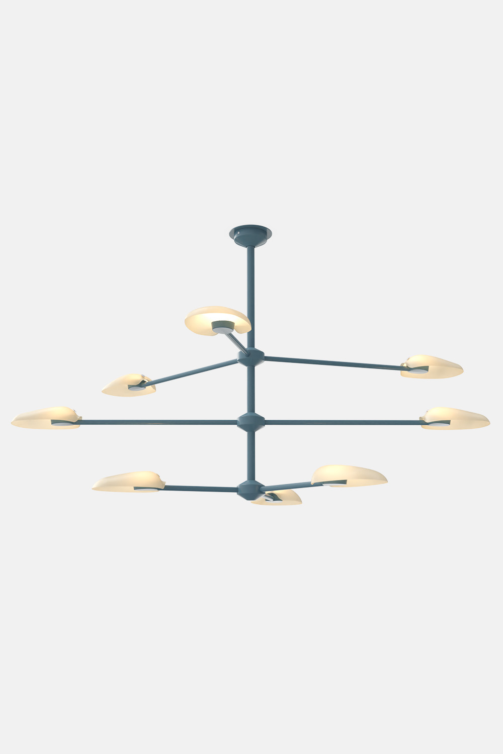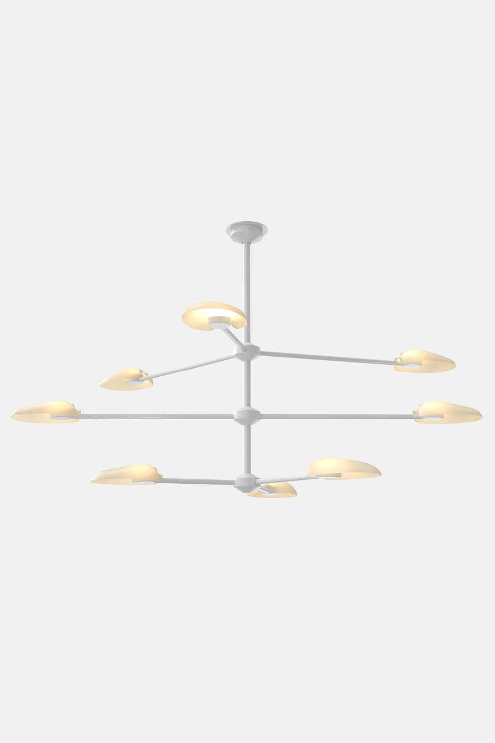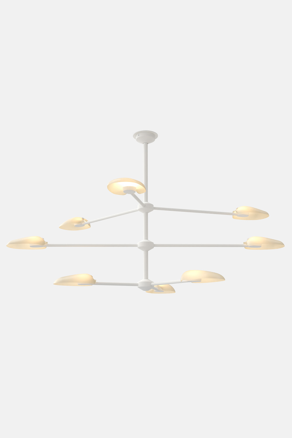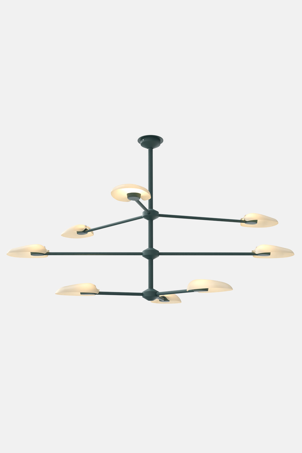 Inspired by organic forms, each branch of the Pilot chandelier features a rounded, shell-like shade. Available in a range of colors, lengths, and finishes, the compositions of these branches are a sculptural exercise; options range from a linear beam suited to the long dining table, or an elaborate starburst ideal for a grand foyer.