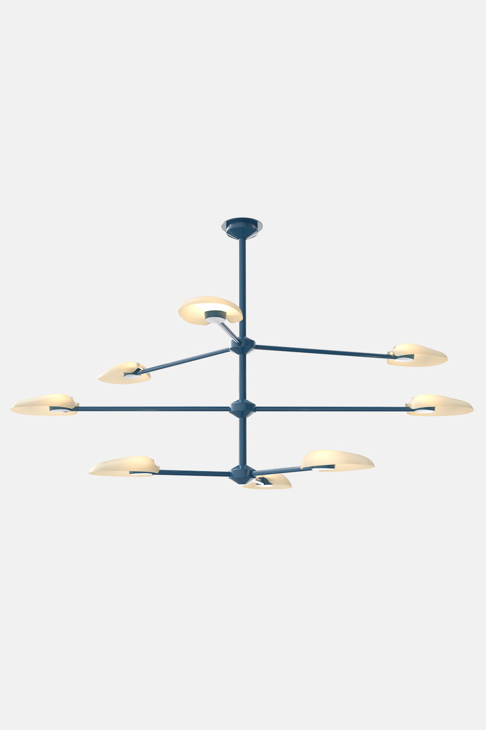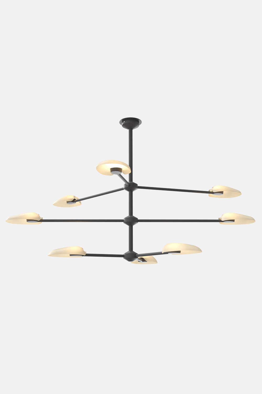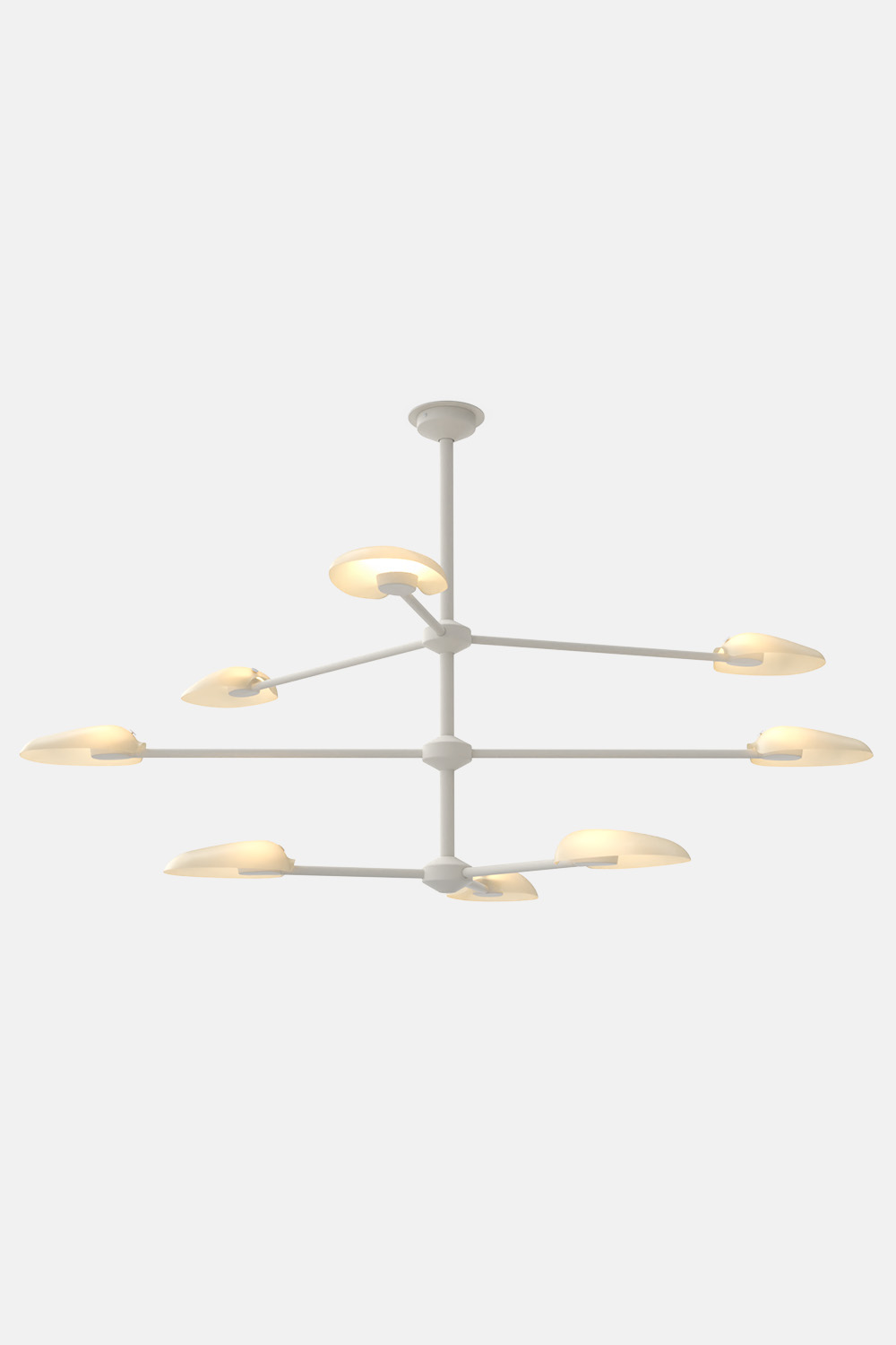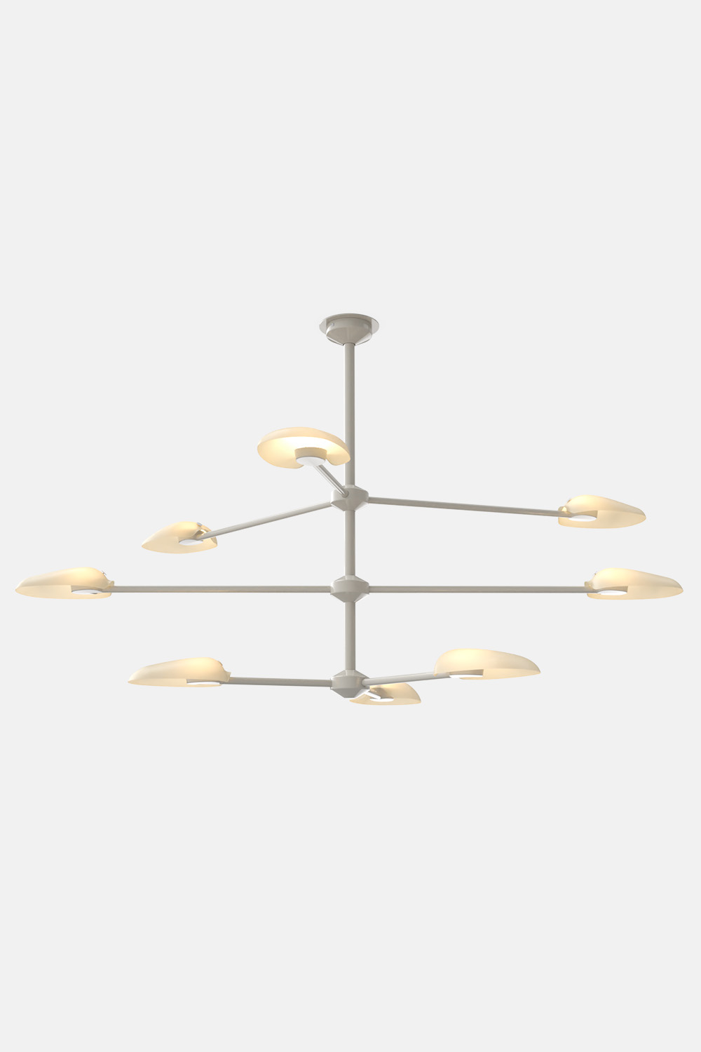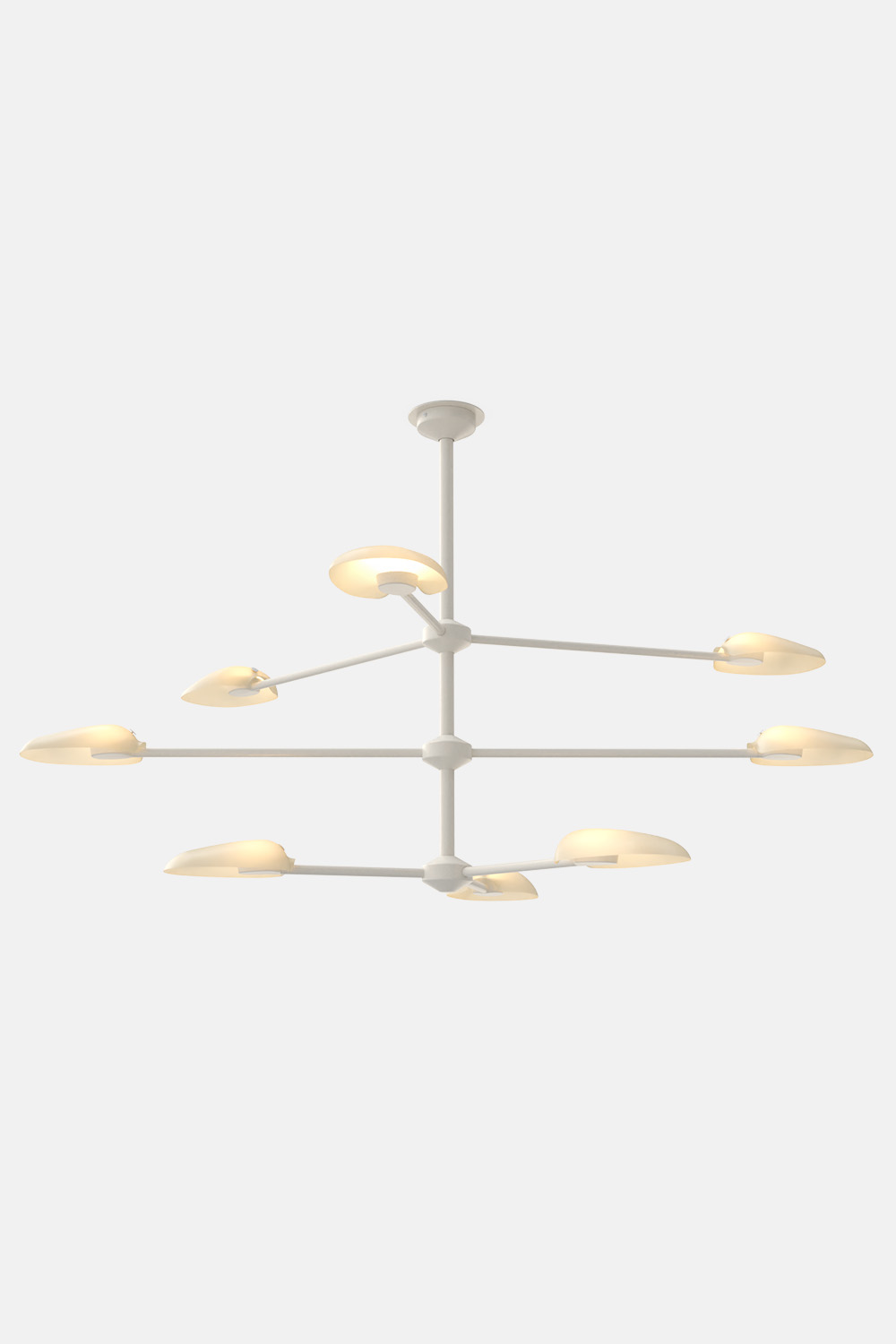 Inspired by organic forms, each branch of the Pilot chandelier features a rounded, shell-like shade. Available in a range of colors, lengths, and finishes, the compositions of these branches are a sculptural exercise; options range from a linear beam suited to the long dining table, or an elaborate starburst ideal for a grand foyer.