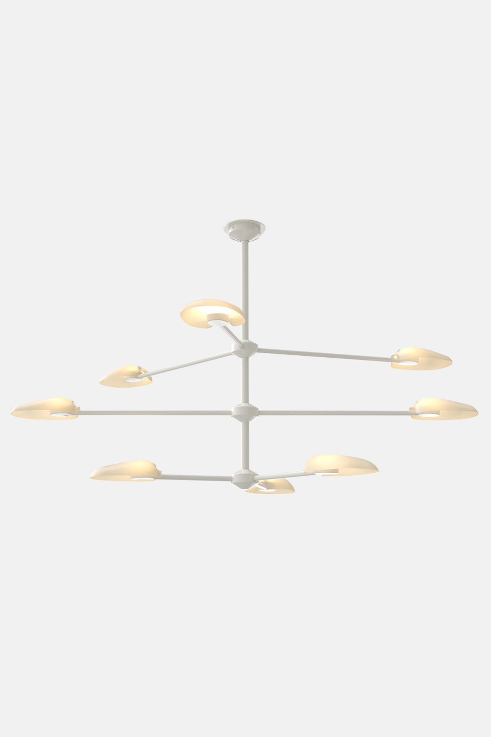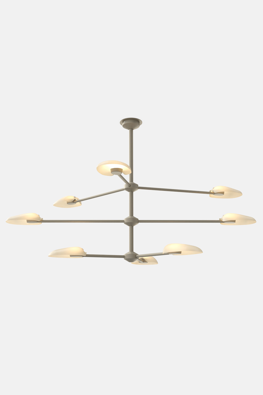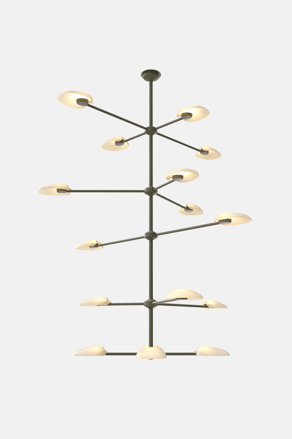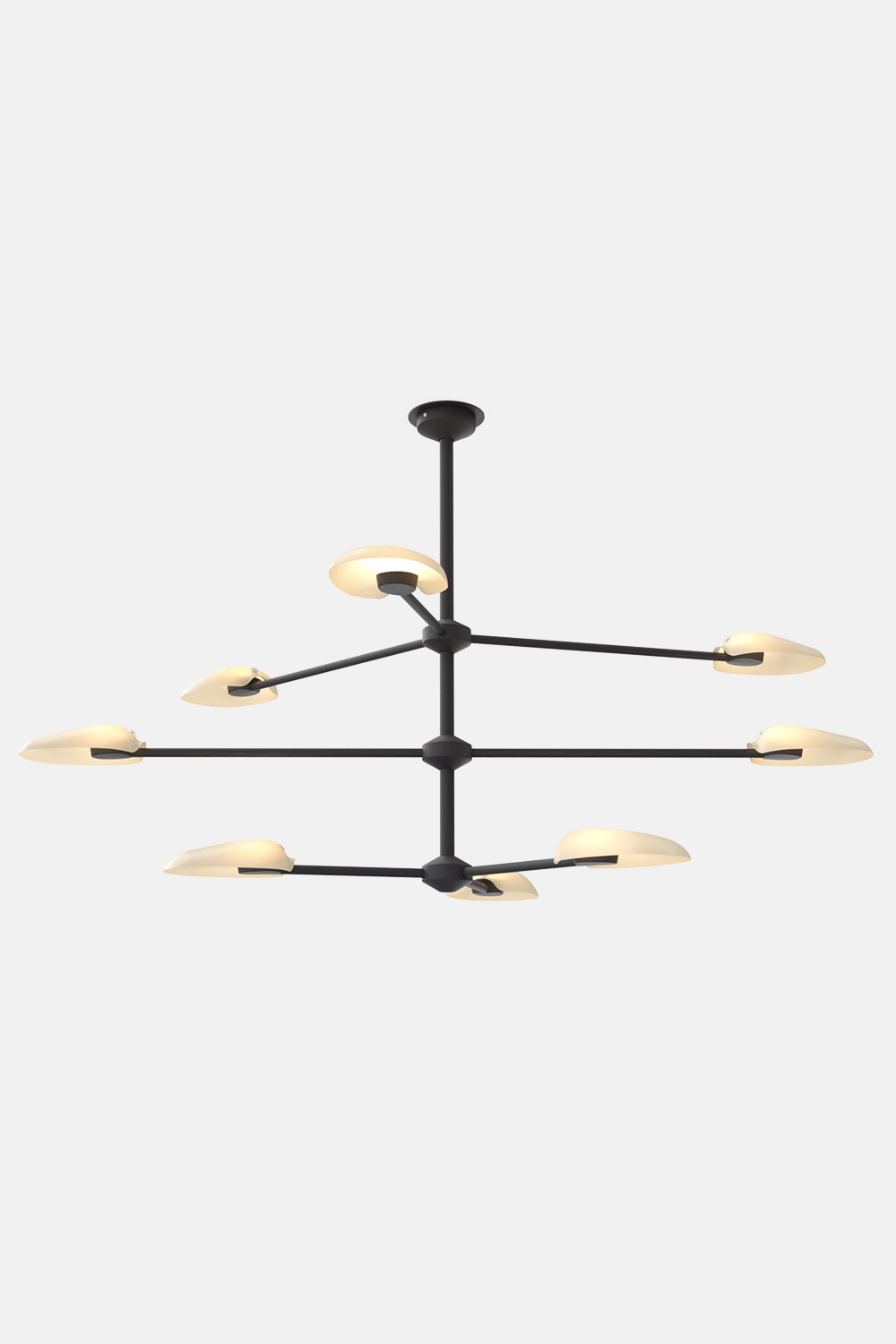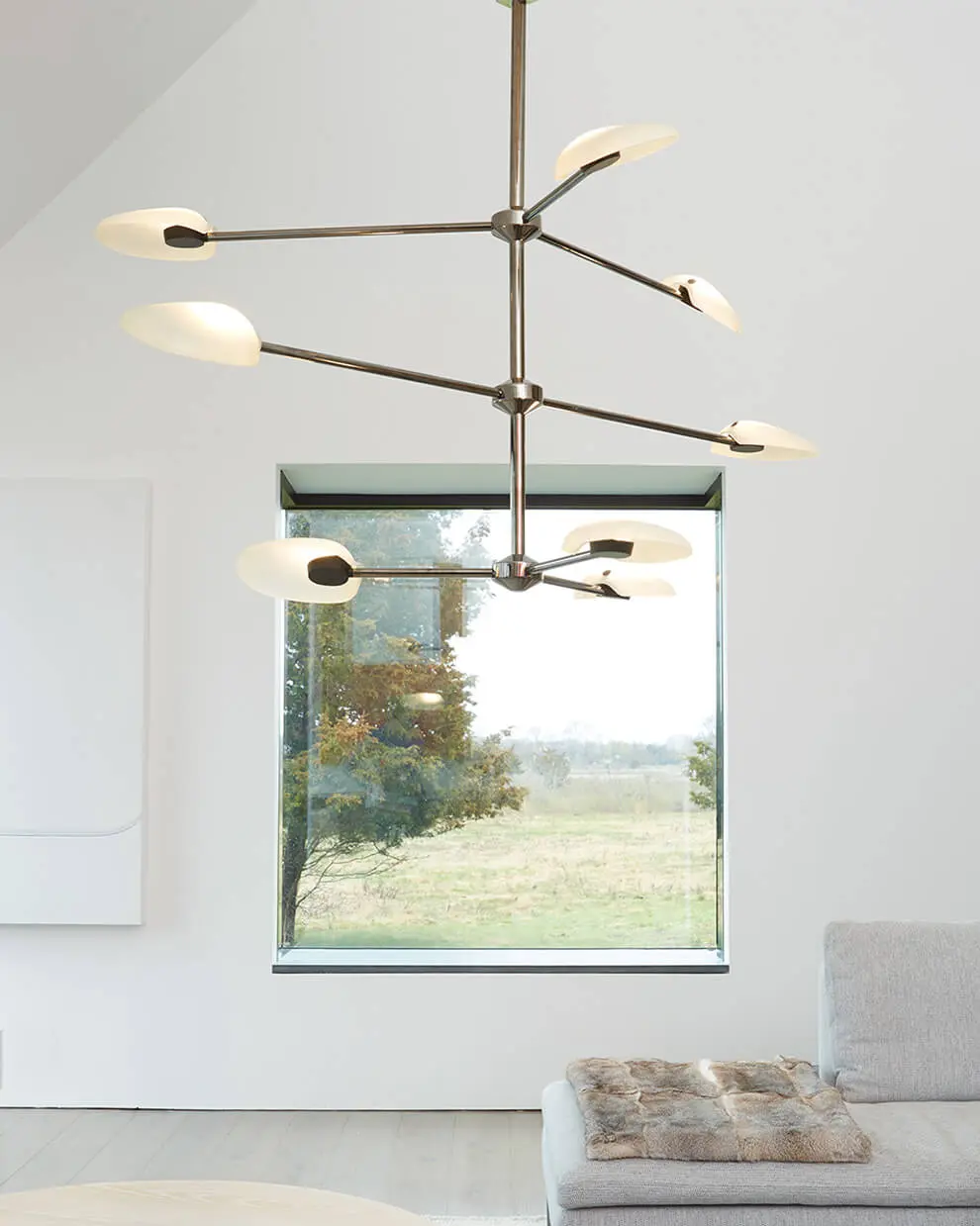 Inspired by organic forms, each branch of the Pilot chandelier features a rounded, shell-like shade. Available in a range of colors, lengths, and finishes, the compositions of these branches are a sculptural exercise; options range from a linear beam suited to the long dining table, or an elaborate starburst ideal for a grand foyer.