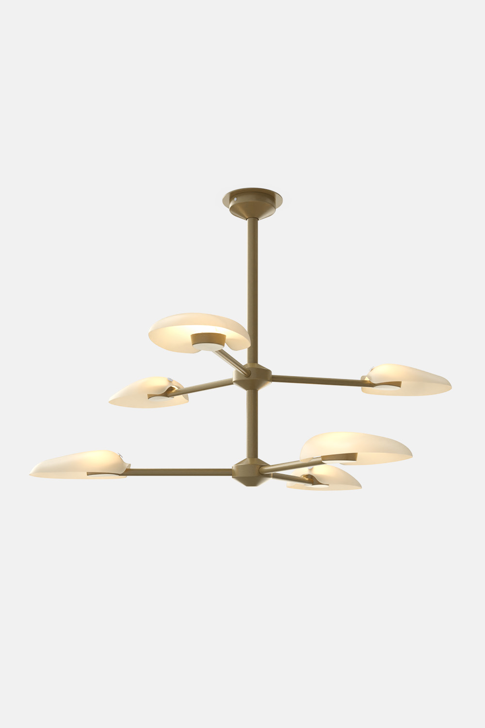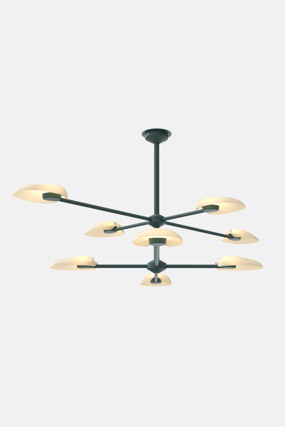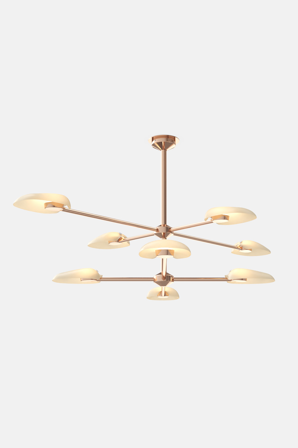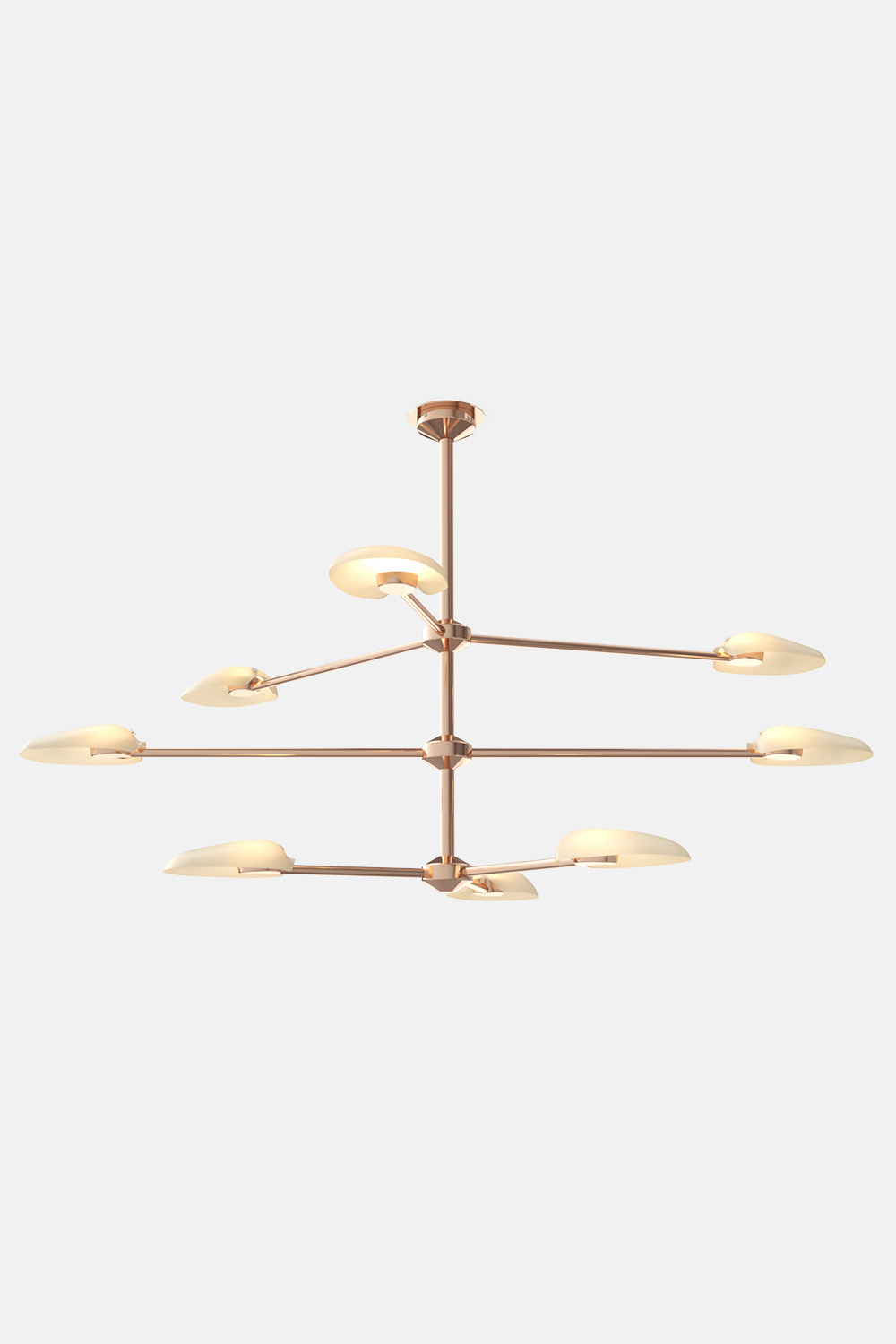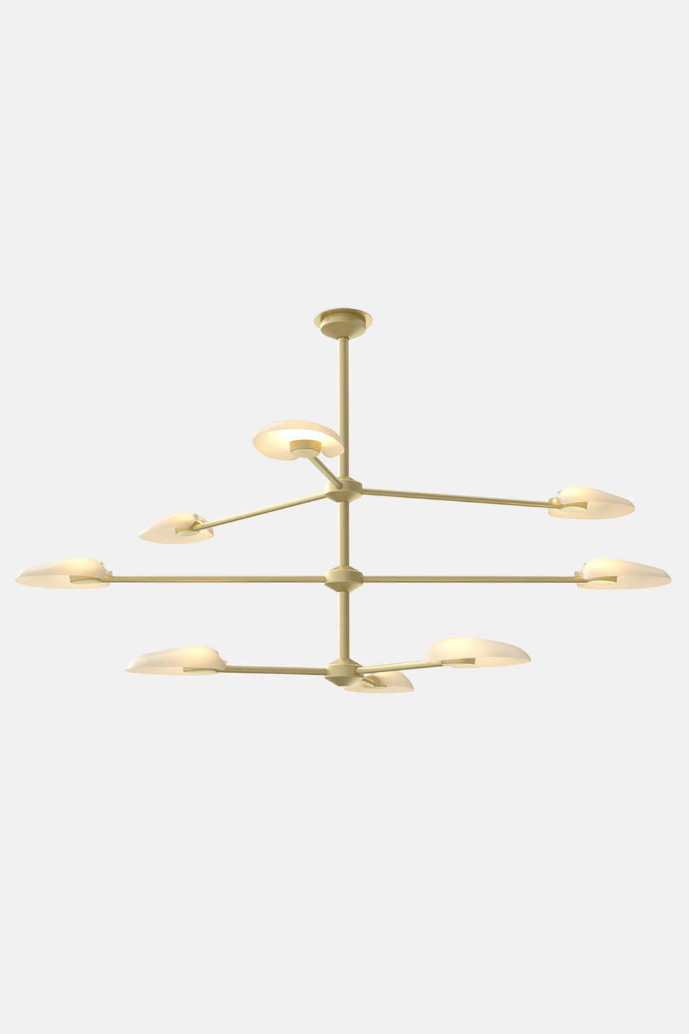 Inspired by organic forms, each branch of the Pilot chandelier features a rounded, shell-like shade. Available in a range of colors, lengths, and finishes, the compositions of these branches are a sculptural exercise; options range from a linear beam suited to the long dining table, or an elaborate starburst ideal for a grand foyer.