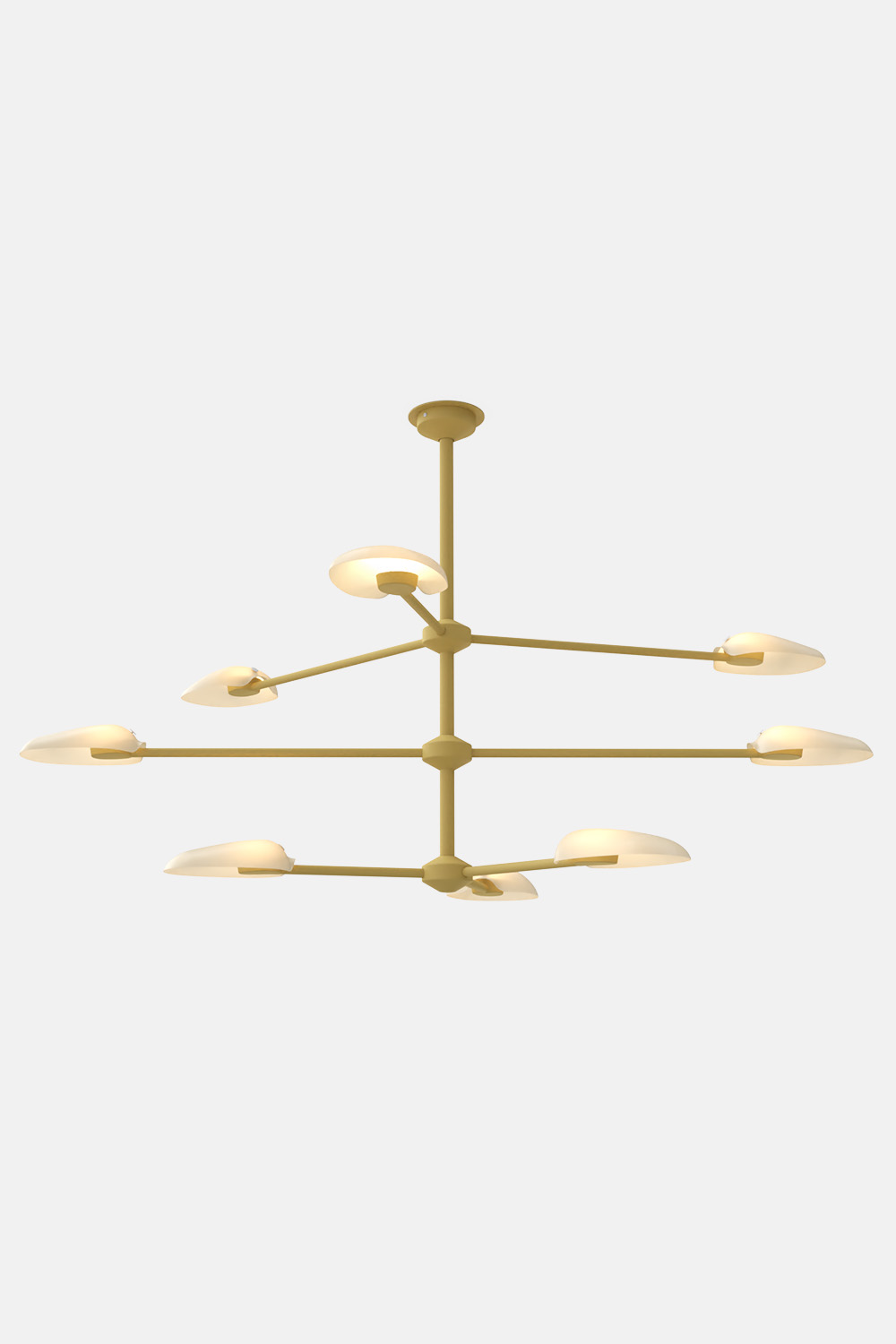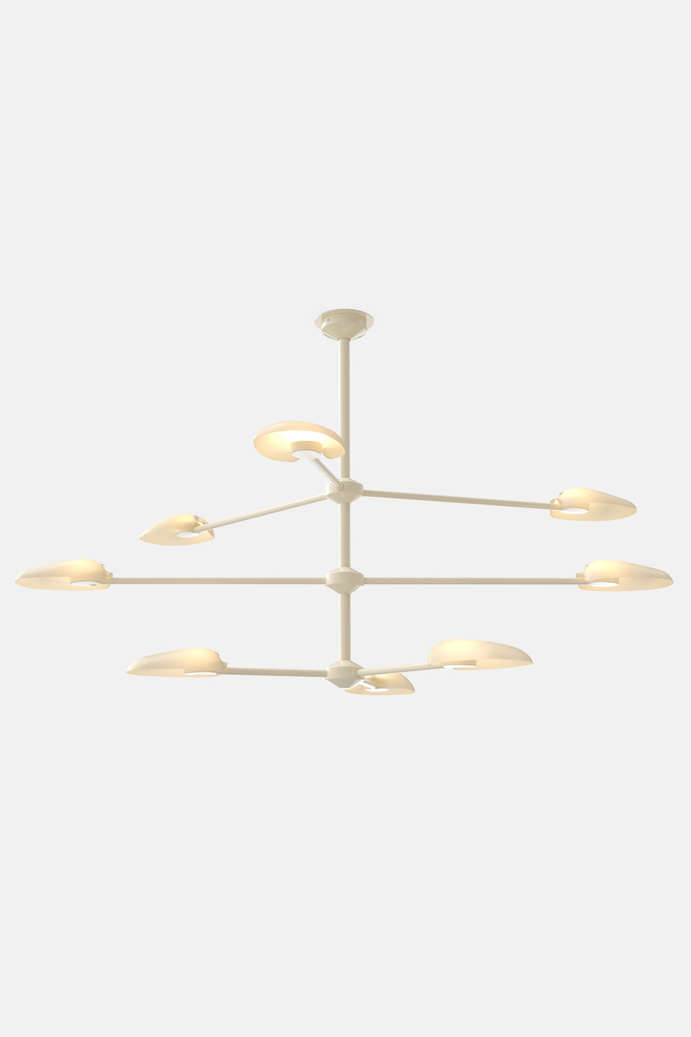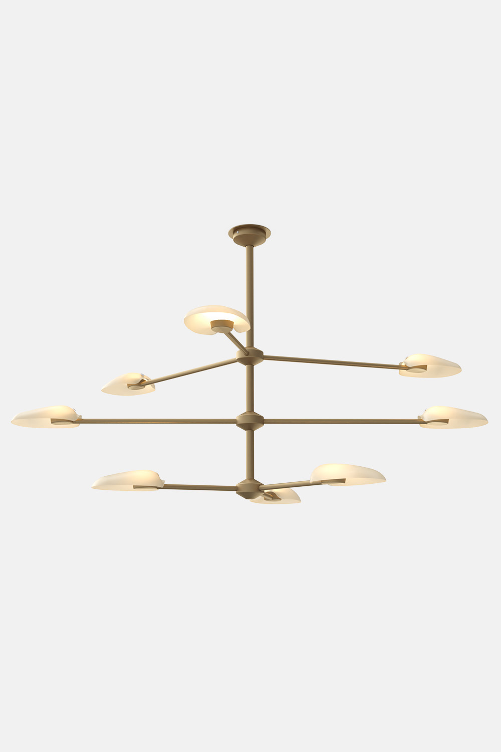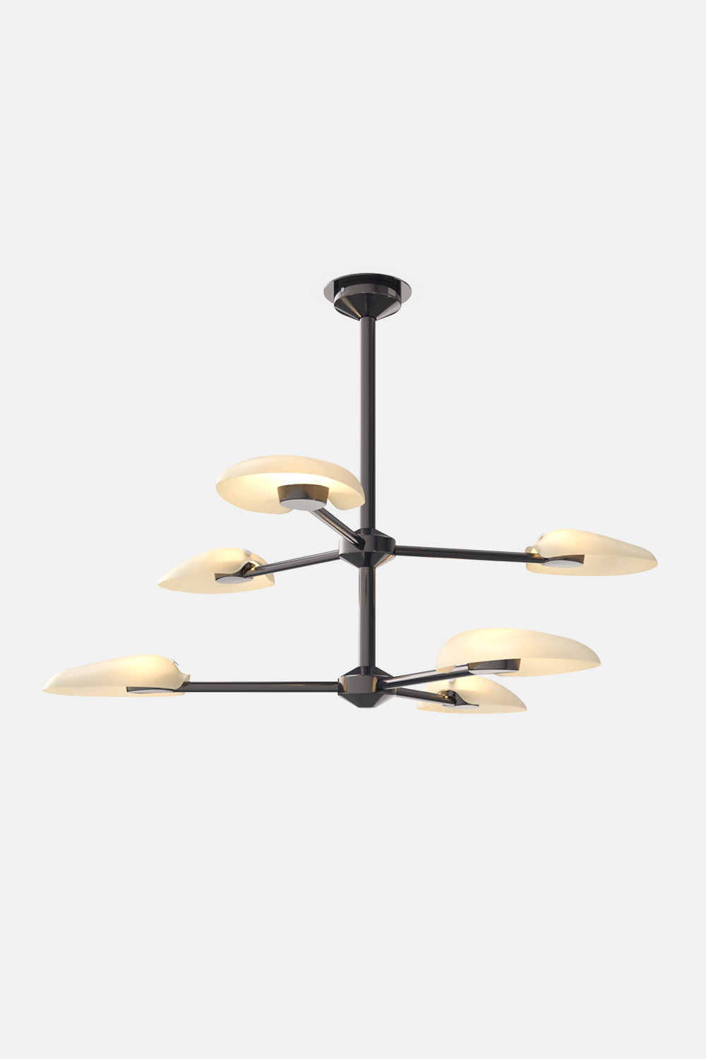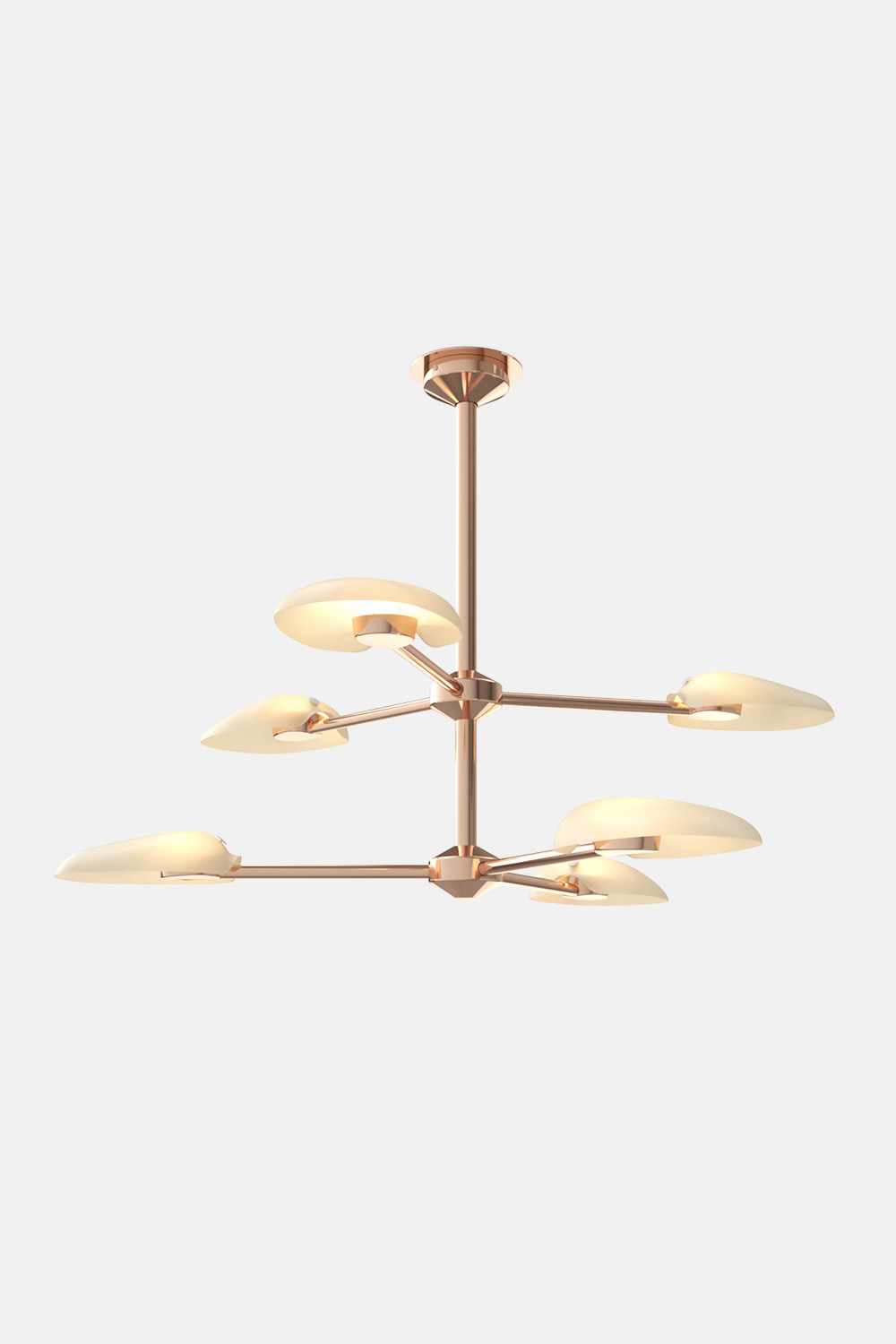 Inspired by organic forms, each branch of the Pilot chandelier features a rounded, shell-like shade. Available in a range of colors, lengths, and finishes, the compositions of these branches are a sculptural exercise; options range from a linear beam suited to the long dining table, or an elaborate starburst ideal for a grand foyer.