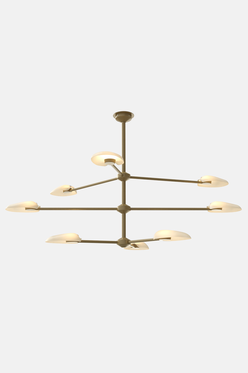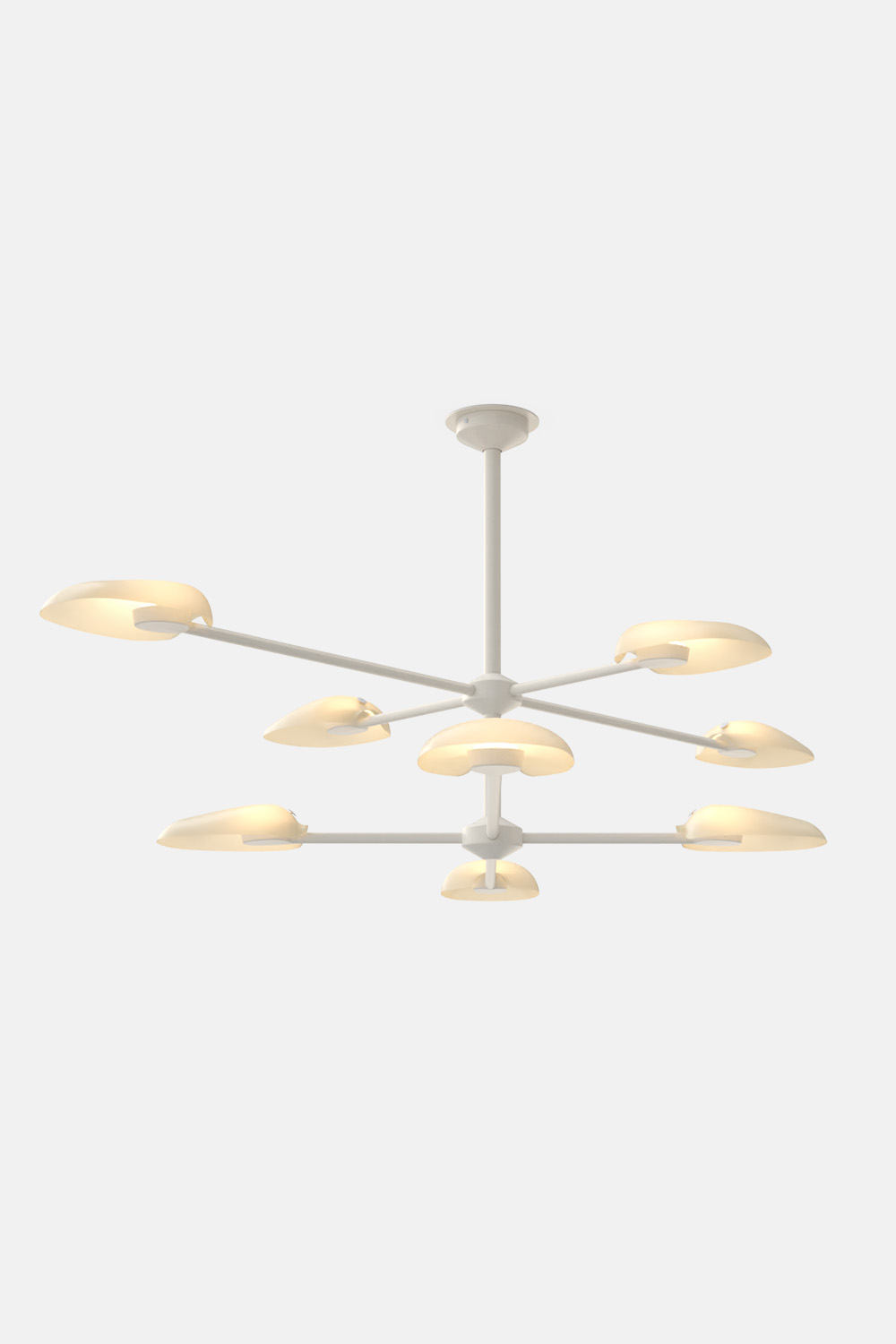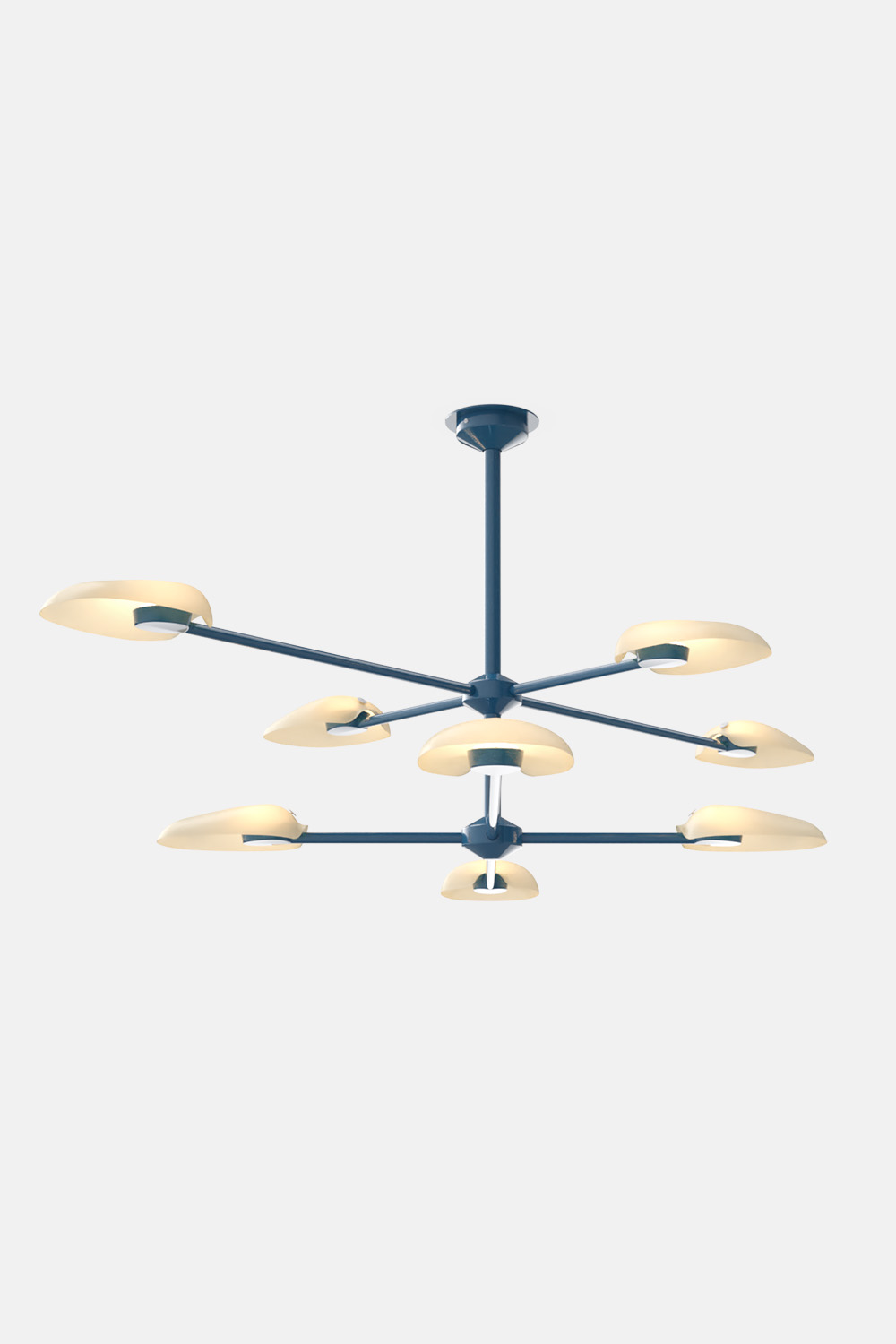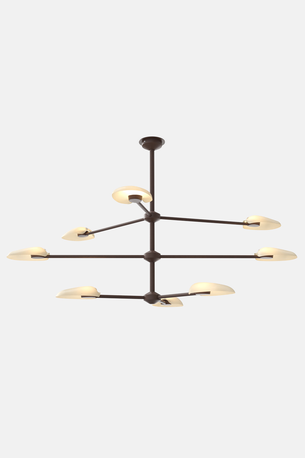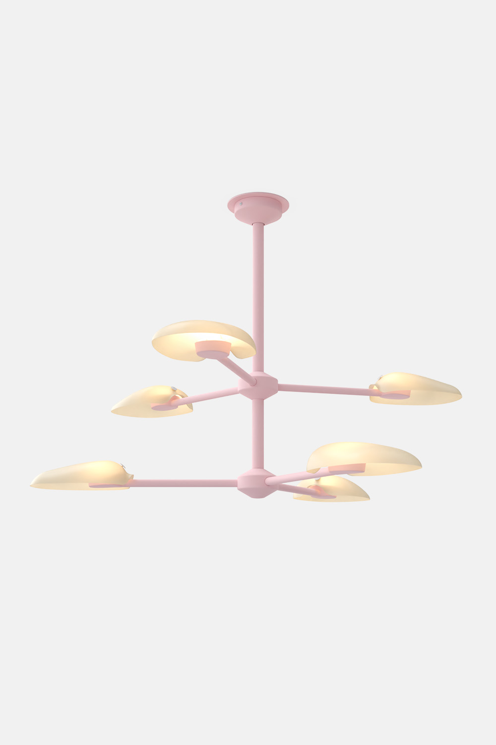 Inspired by organic forms, each branch of the Pilot chandelier features a rounded, shell-like shade. Available in a range of colors, lengths, and finishes, the compositions of these branches are a sculptural exercise; options range from a linear beam suited to the long dining table, or an elaborate starburst ideal for a grand foyer.
