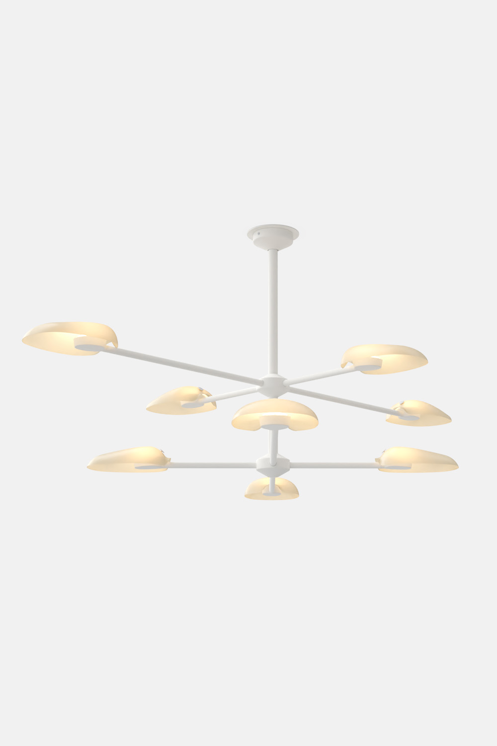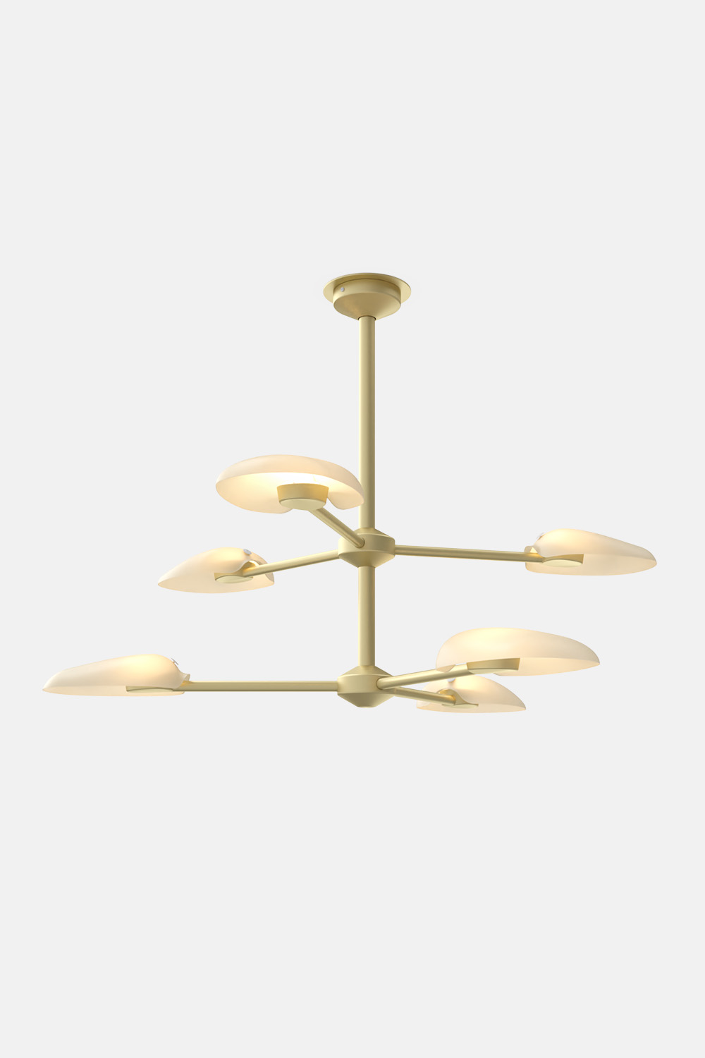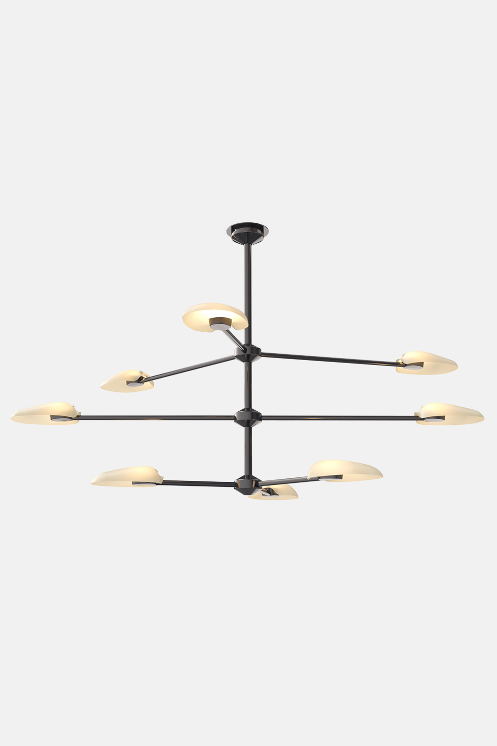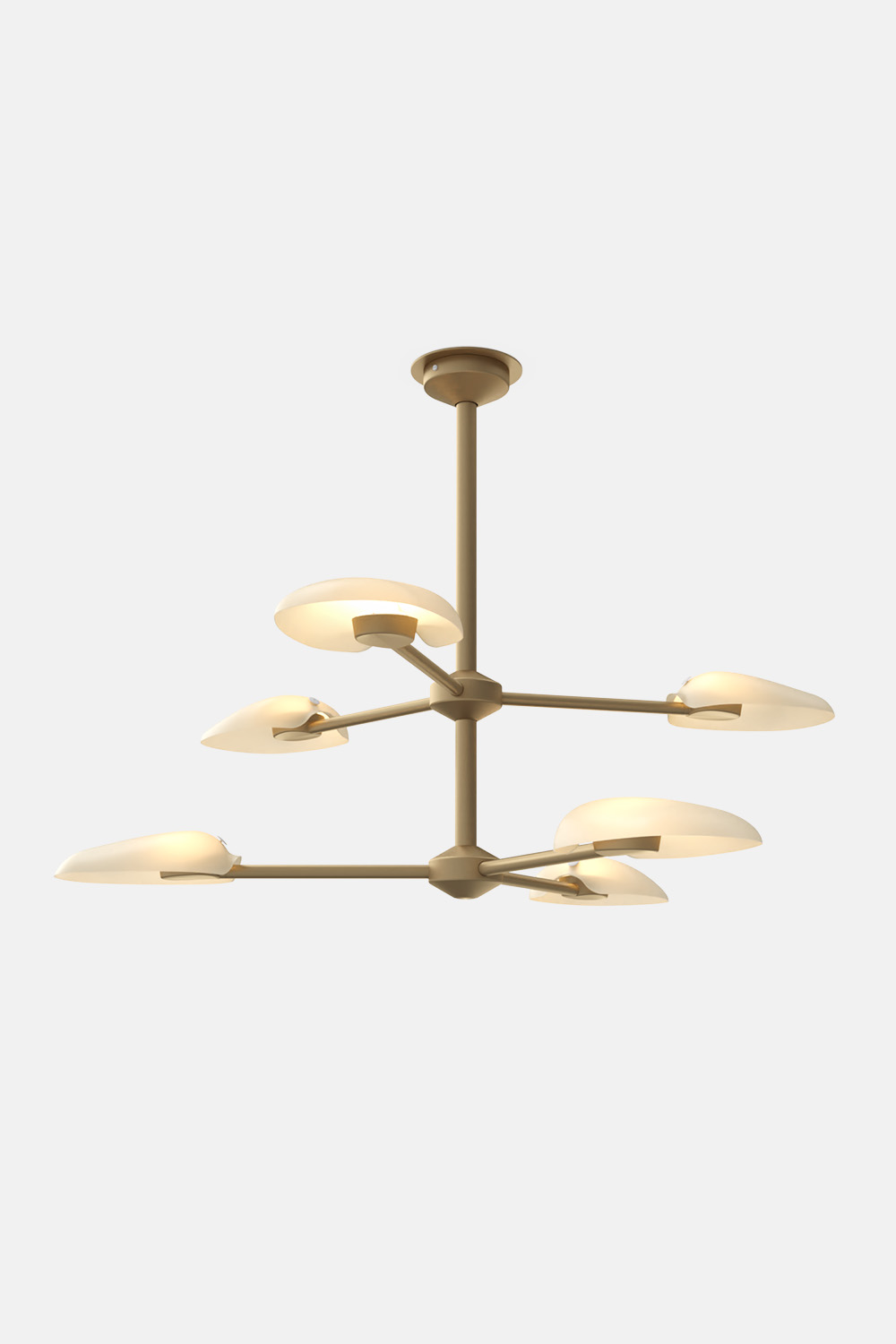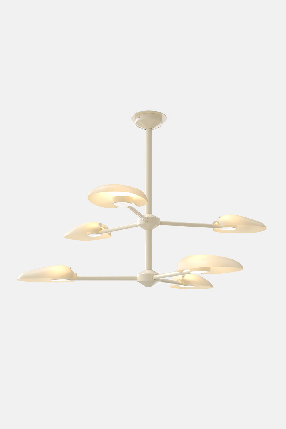 Inspired by organic forms, each branch of the Pilot chandelier features a rounded, shell-like shade. Available in a range of colors, lengths, and finishes, the compositions of these branches are a sculptural exercise; options range from a linear beam suited to the long dining table, or an elaborate starburst ideal for a grand foyer.