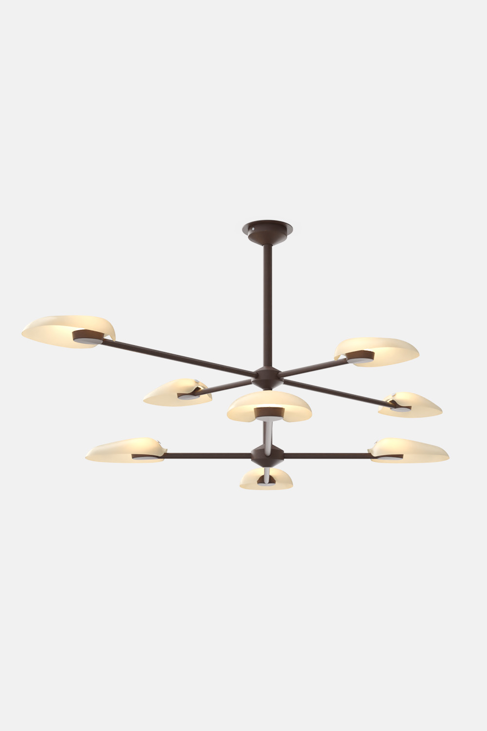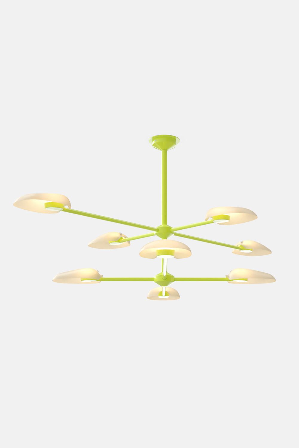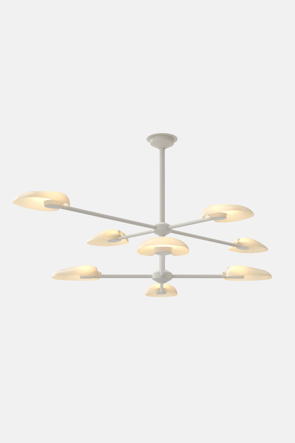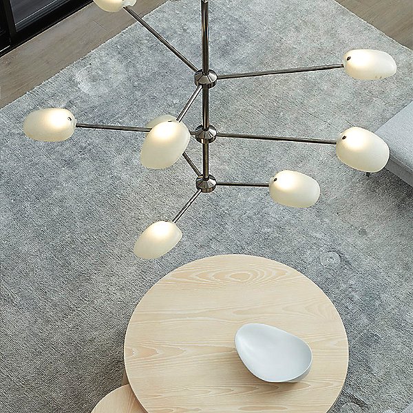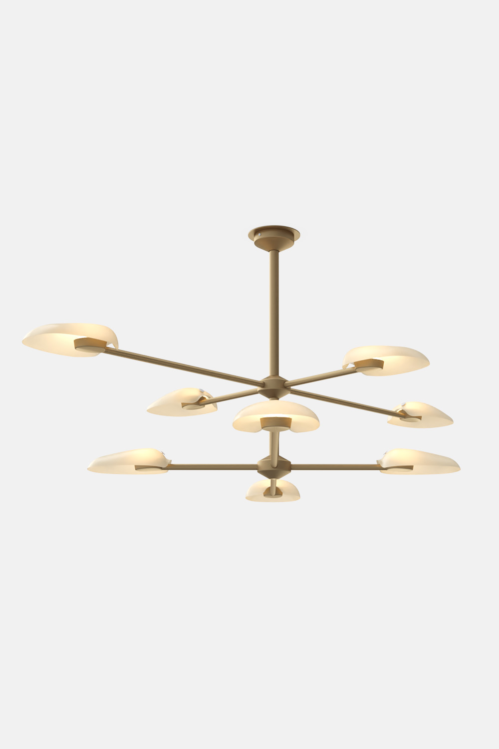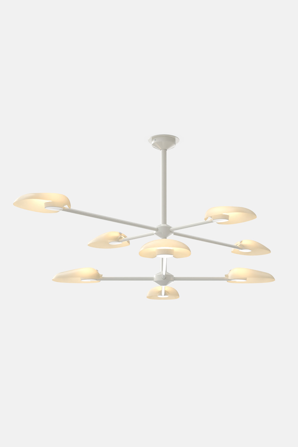 Inspired by organic forms, each branch of the Pilot chandelier features a rounded, shell-like shade. Available in a range of colors, lengths, and finishes, the compositions of these branches are a sculptural exercise; options range from a linear beam suited to the long dining table, or an elaborate starburst ideal for a grand foyer.