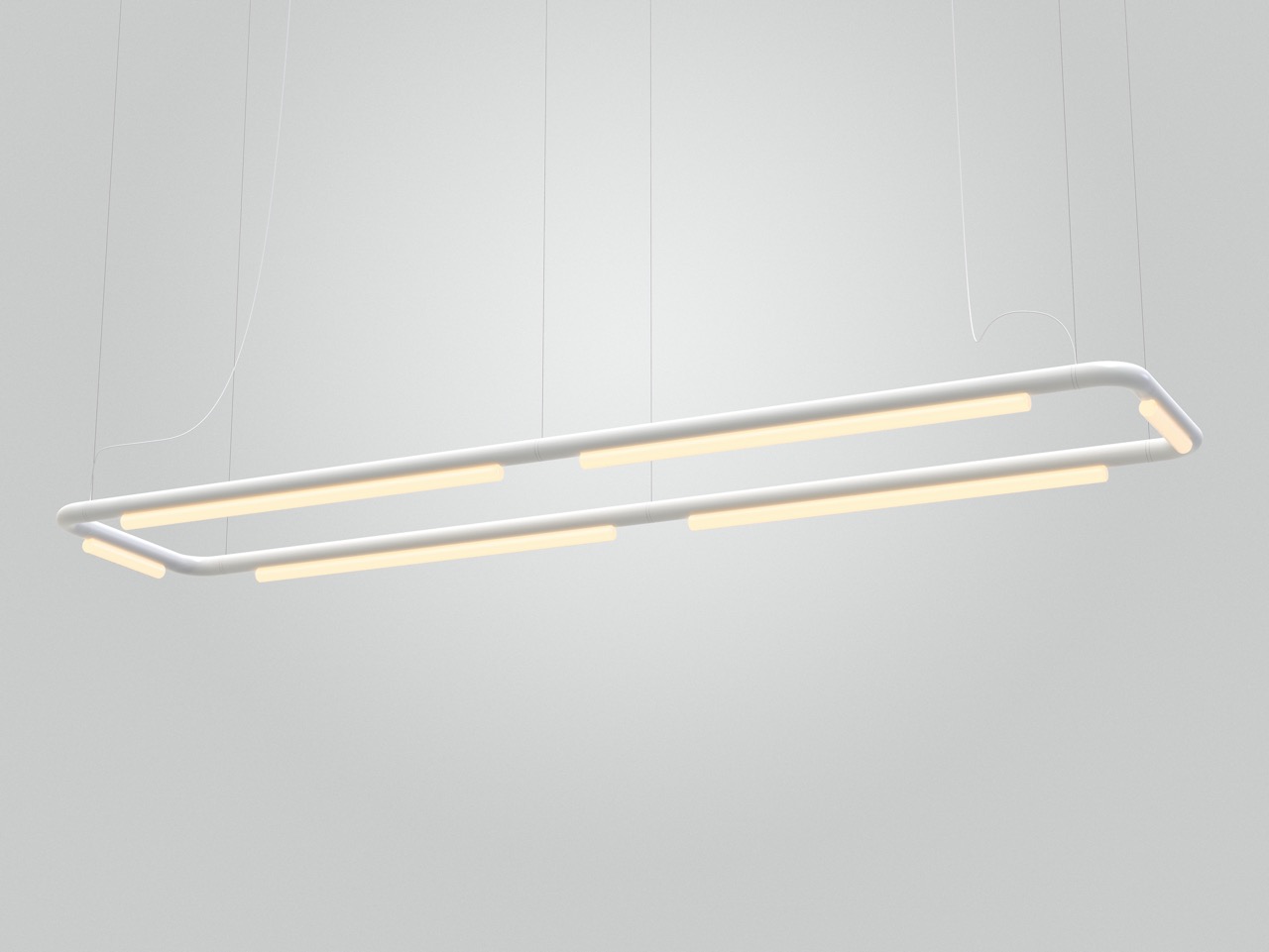 Stark, elegant, and resolute, The Pipeline 40 pendant lamp suspends horizontally from 1mm thin aircraft cables, creating the illusion of floating in air. The understated fixture uniformly emits a wide horizontal beam of light through a specially developed diffuser designed to soften LED light while maximizing output.