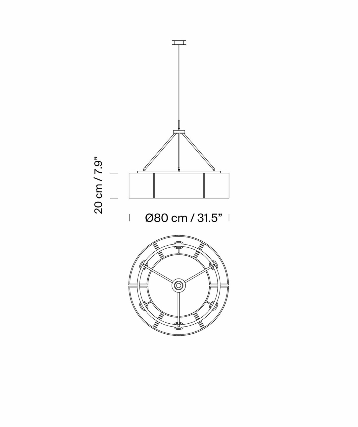 This circle of double–sided shades produces a beautifully nuanced light reminiscent of the medieval cast iron luminaire, with multiple light sources. Its doubled–sided shades are divided into six 60º sections or twelve 30º sections, depending on the chosen size.