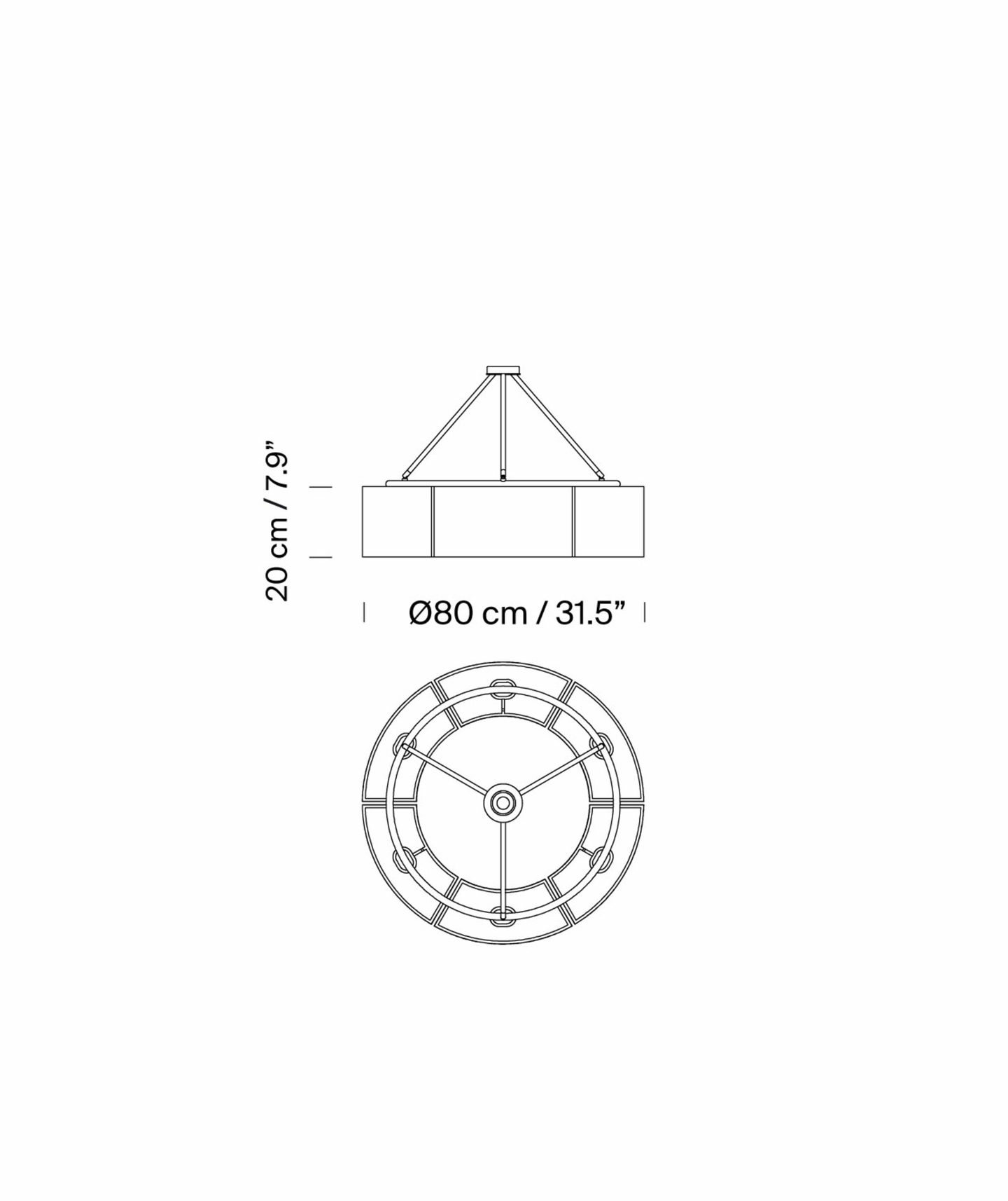 This circle of double–sided shades produces a beautifully nuanced light reminiscent of the medieval cast iron luminaire, with multiple light sources. Its doubled–sided shades are divided into six 60º sections or twelve 30º sections, depending on the chosen size.