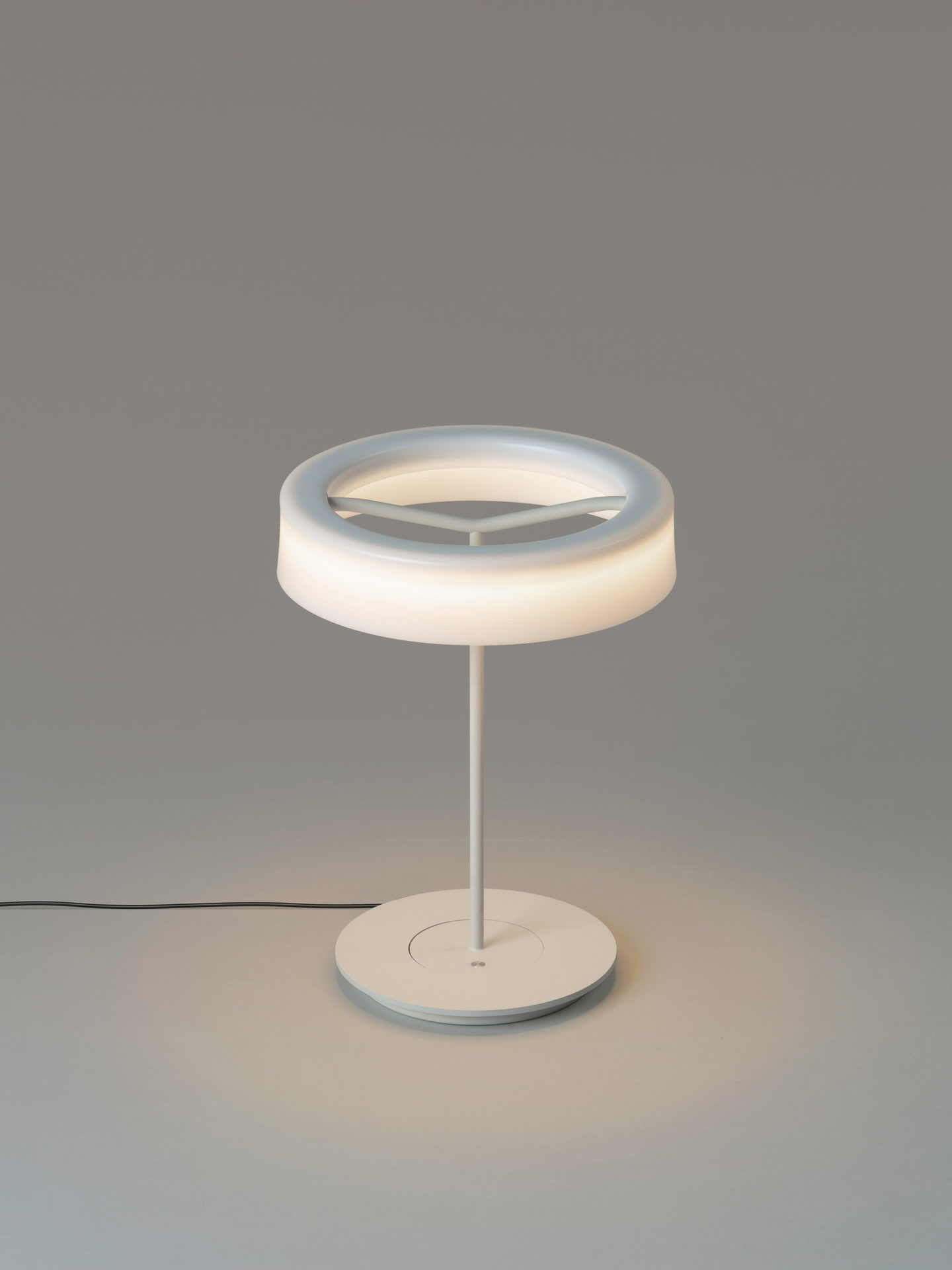 A lamp that combines simplicity and technology to create a lucent ring of light suspended in the air. It comes in two sizes, both available in matte white or graphite, to which a shade can be affixed. Or they can be left without a shade, unapologetic. Sin broadly illuminates any work surface with direct, warm light, and does not take up space on a desk because all kinds of errant items can be kept on its base, including papers.