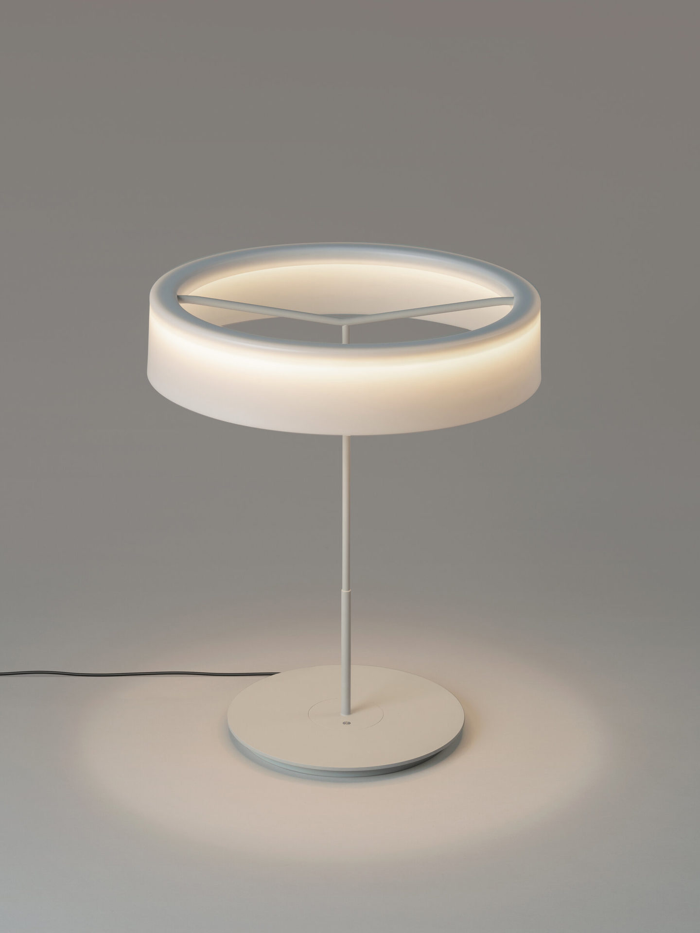 A lamp that combines simplicity and technology to create a lucent ring of light suspended in the air. It comes in two sizes, both available in matte white or graphite, to which a shade can be affixed. Or they can be left without a shade, unapologetic. Sin broadly illuminates any work surface with direct, warm light, and does not take up space on a desk because all kinds of errant items can be kept on its base, including papers.