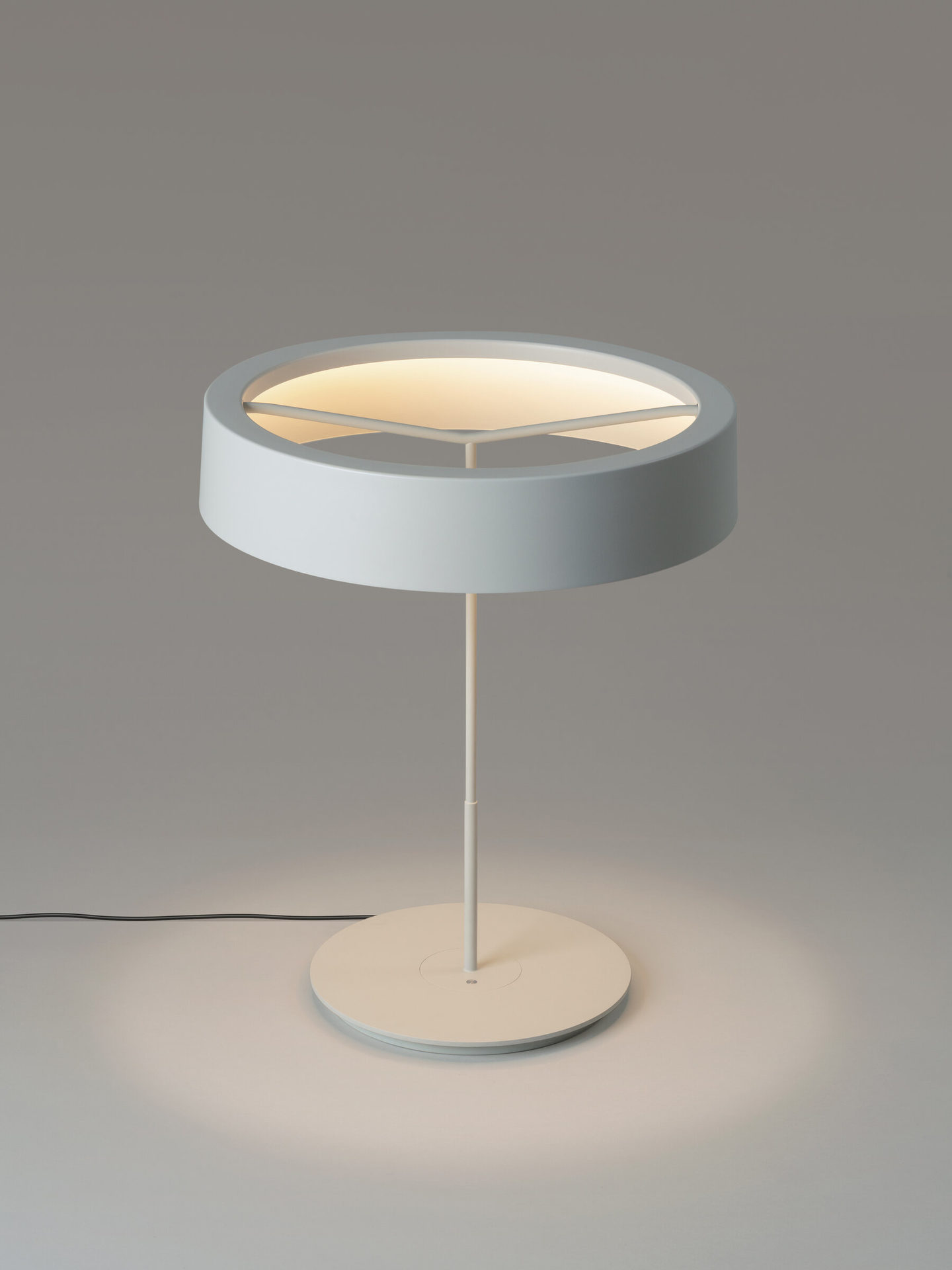 A lamp that combines simplicity and technology to create a lucent ring of light suspended in the air. It comes in two sizes, both available in matte white or graphite, to which a shade can be affixed. Or they can be left without a shade, unapologetic. Sin broadly illuminates any work surface with direct, warm light, and does not take up space on a desk because all kinds of errant items can be kept on its base, including papers.