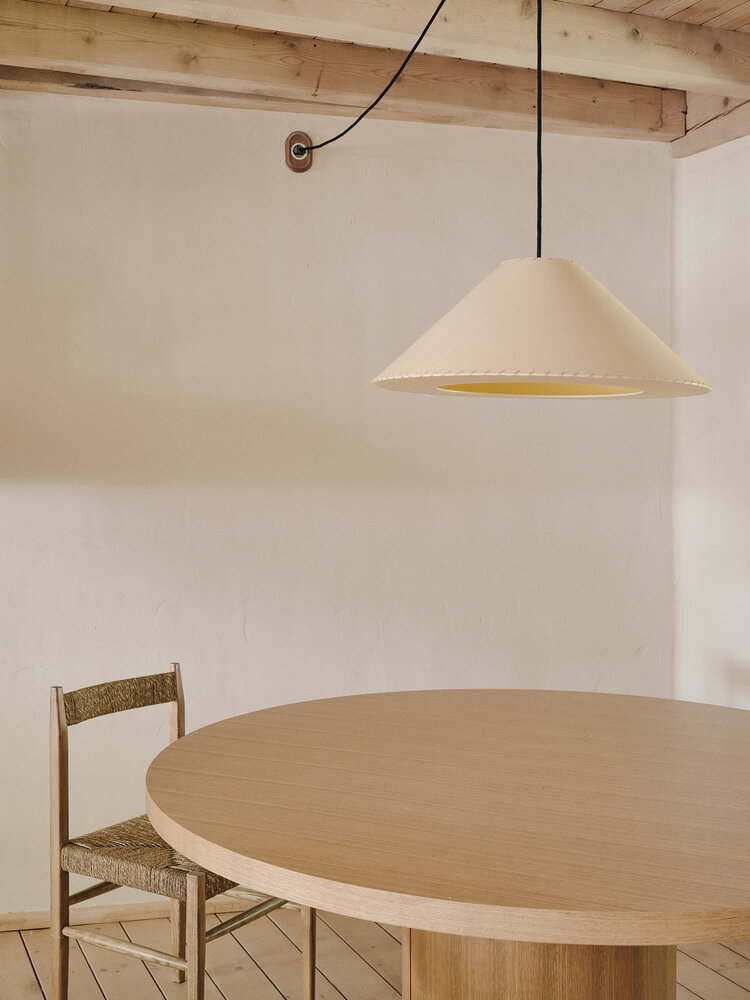 Designed by Gabriel Ordeig in 1987 as a vindication of cardboard and its warm translucence, this shade is an invitation to make the most of table talks. The two options of Stitched cardboard, in beige or white, allow for harmonious existence between object and user.
