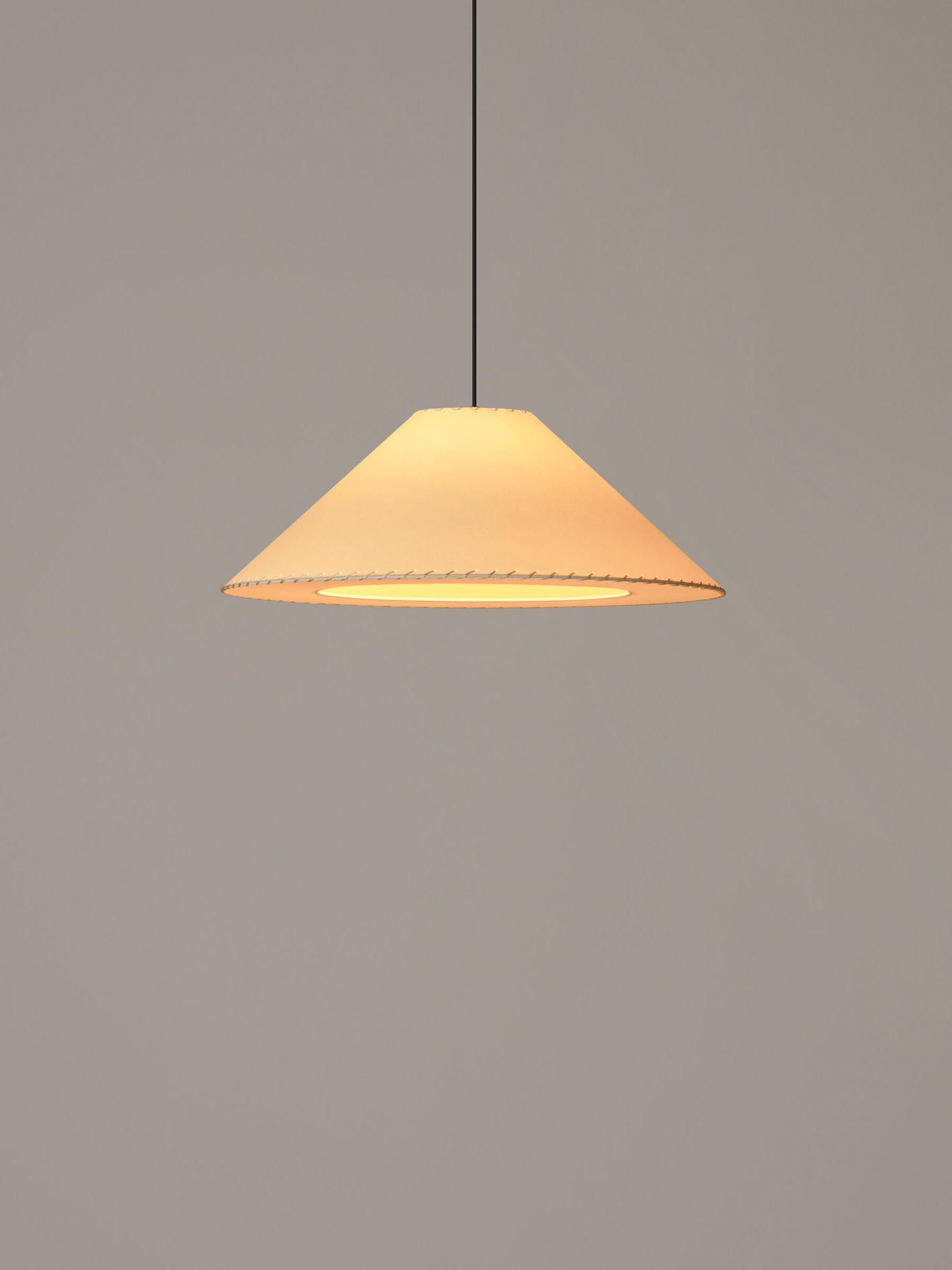 The flat conical shape of the MT4 and MT5 lampshades have a familiar, archetypal silhouette. Its volume may be robust but it is light in its adaptability to the space. Designed by Gabriel Ordeig in 1987 as a vindication of cardboard and its warm translucence, this shade is an invitation to make the most of table talks. The two options of titched cardboard, in beige or white, allow for harmonious oexistence between object and user.