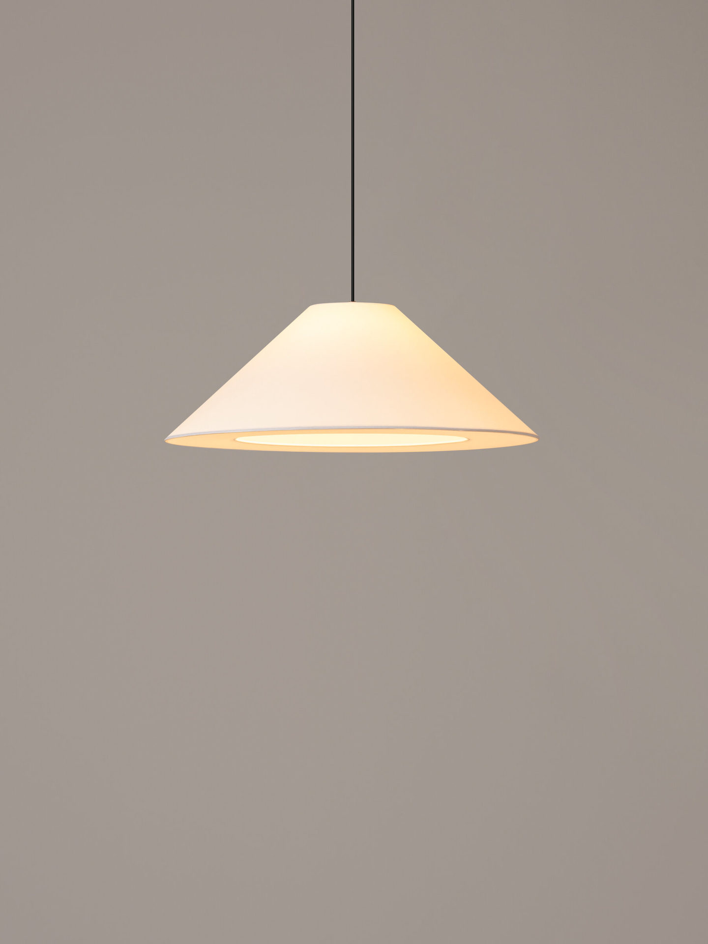 The flat conical shape of the MT4 and MT5 lampshades have a familiar, archetypal silhouette. Its volume may be robust but it is light in its adaptability to the space. Designed by Gabriel Ordeig in 1987 as a vindication of cardboard and its warm translucence, this shade is an invitation to make the most of table talks. The two options of titched cardboard, in beige or white, allow for harmonious oexistence between object and user.