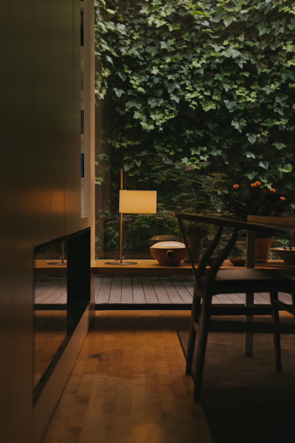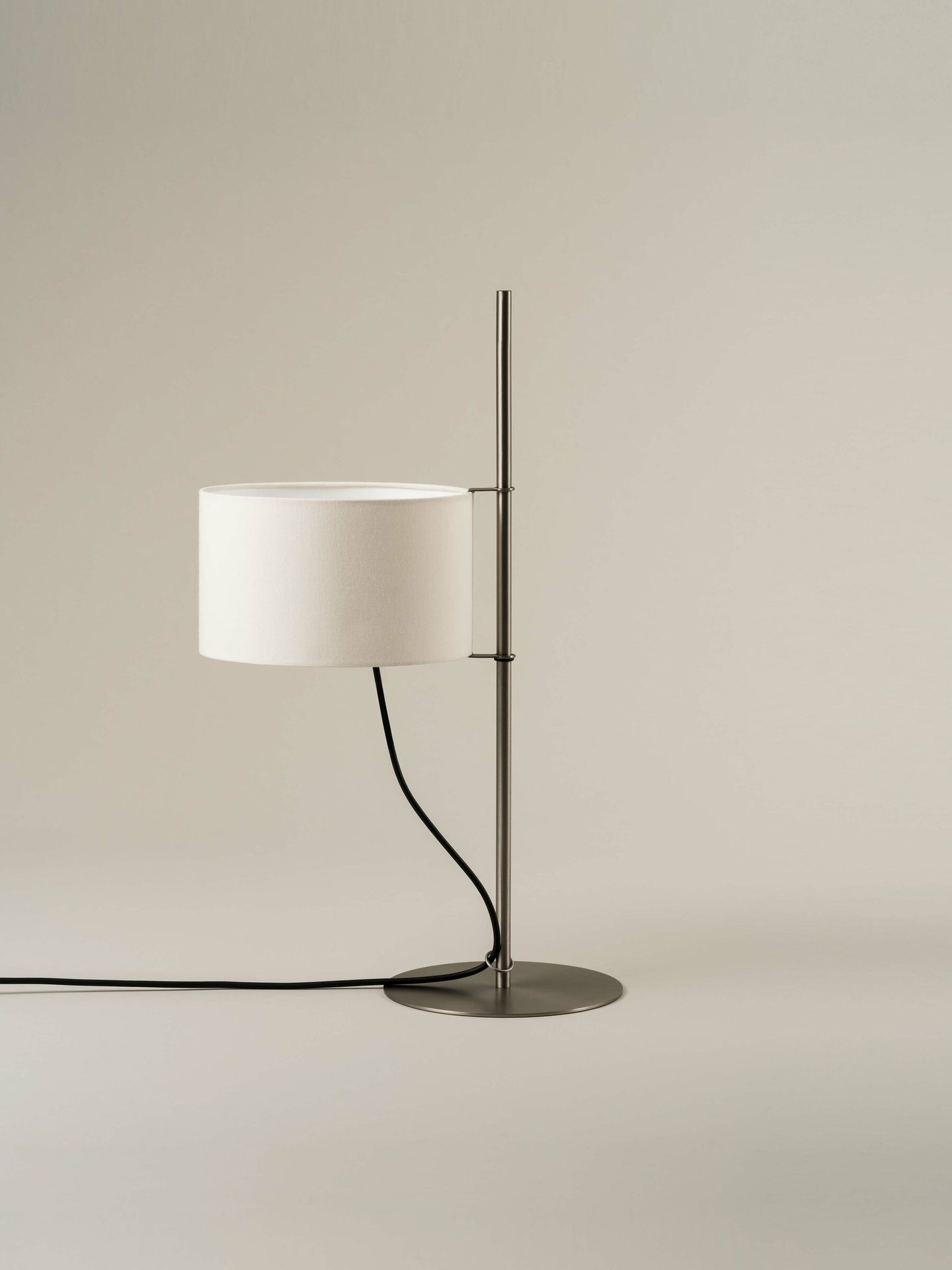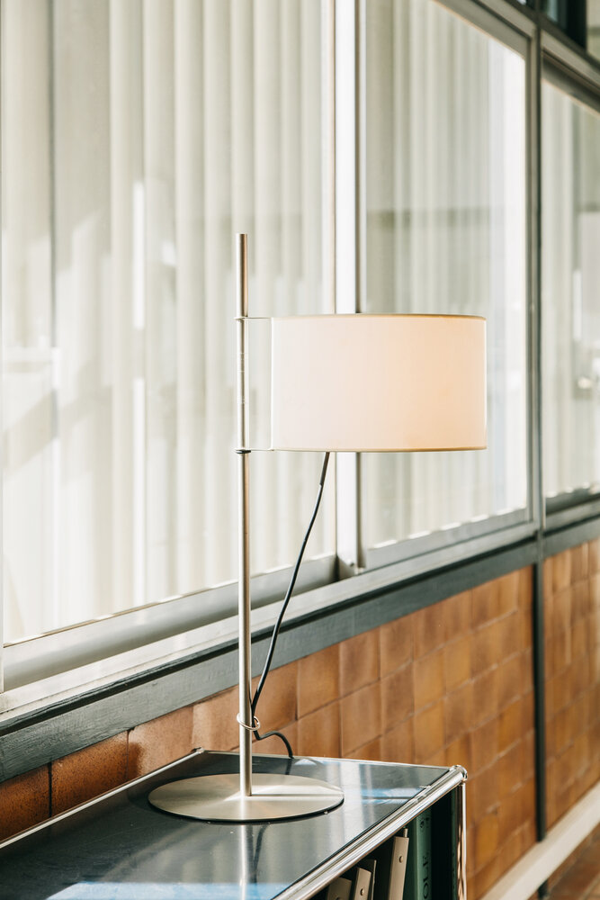 With a structure supported by a circular metal base, the while linen shade of the TMD lamp looks like a sail hoisted on a mast. Whether switched on or off, the TMD manages to add warmth to the space around it. Another example of the timeless sobriety of Miguel Milá.