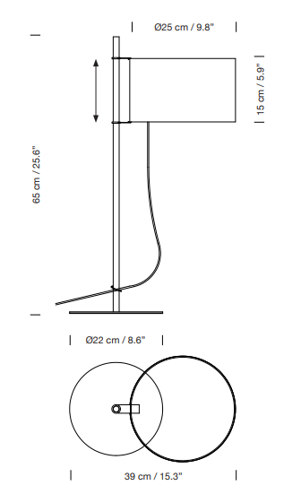 Based on his famous TMM lamp, Miguel Milá was commissioned to design the TMD tabletop version. The designer came up with the idea of a shade that is raised like a flag up a mast.In order to reduce the number of sections, he replaced wood with metal and the cross-shaped base for a circular one, taking up less space on a crowded desk. The inventive engineering remains the same \x97 the shade's height is adjustable via a rubber band stopper, and the light is switched on/off by pulling lightly on the cable. A thin metal ring is used to wrap and direct the cable along the shaft. The elegant lampshade, made of white linen fabric, creates a warm ambient light. With this exquisite blend of materials, the TMD lamp adds warmth to any room, even with the light off.