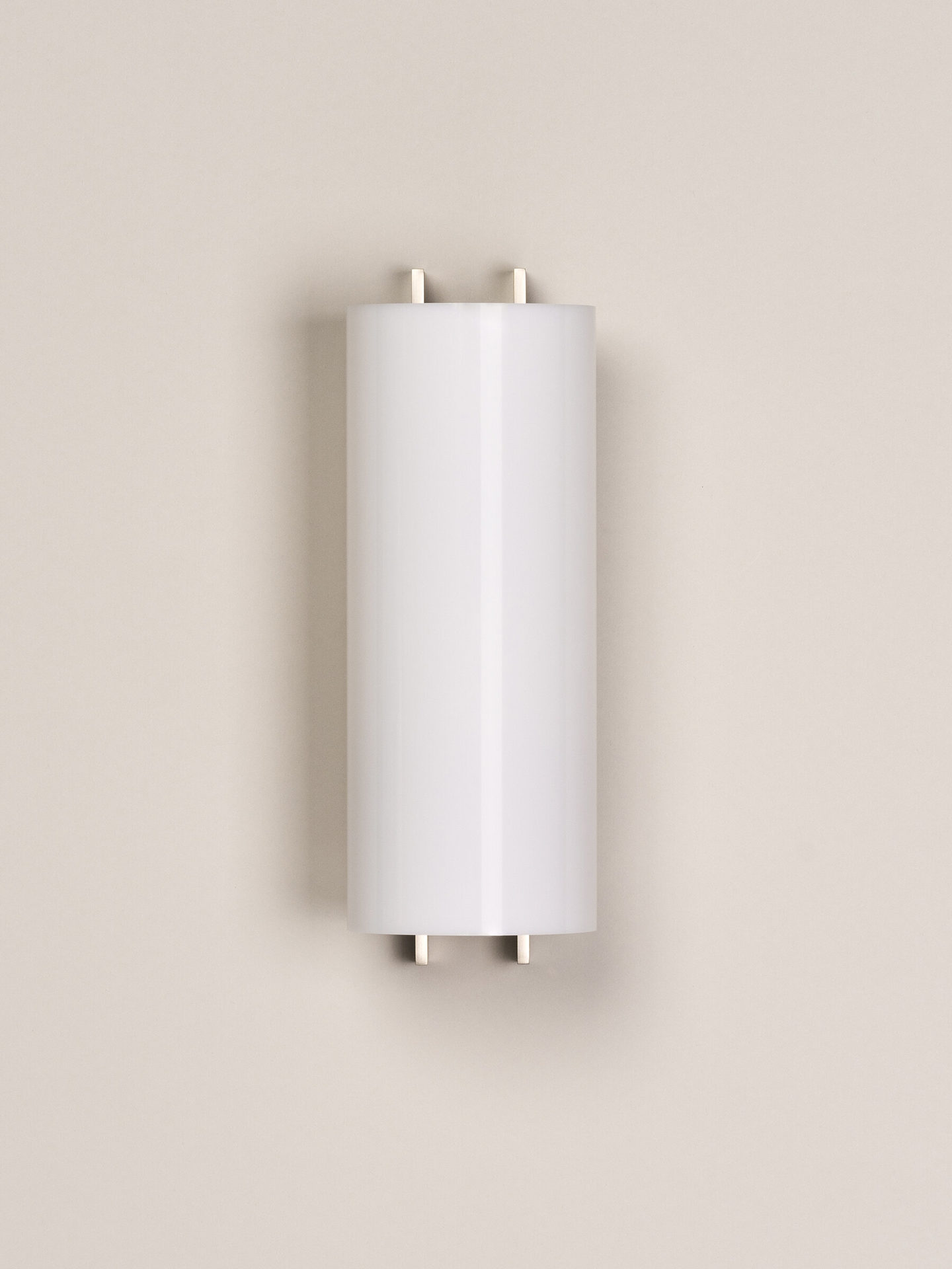 This variation on the long TMM wall lamp incorporates a metal channel and a white methacrylate shade, making both materials more damp–resistant than their wooden and parchment counterparts.