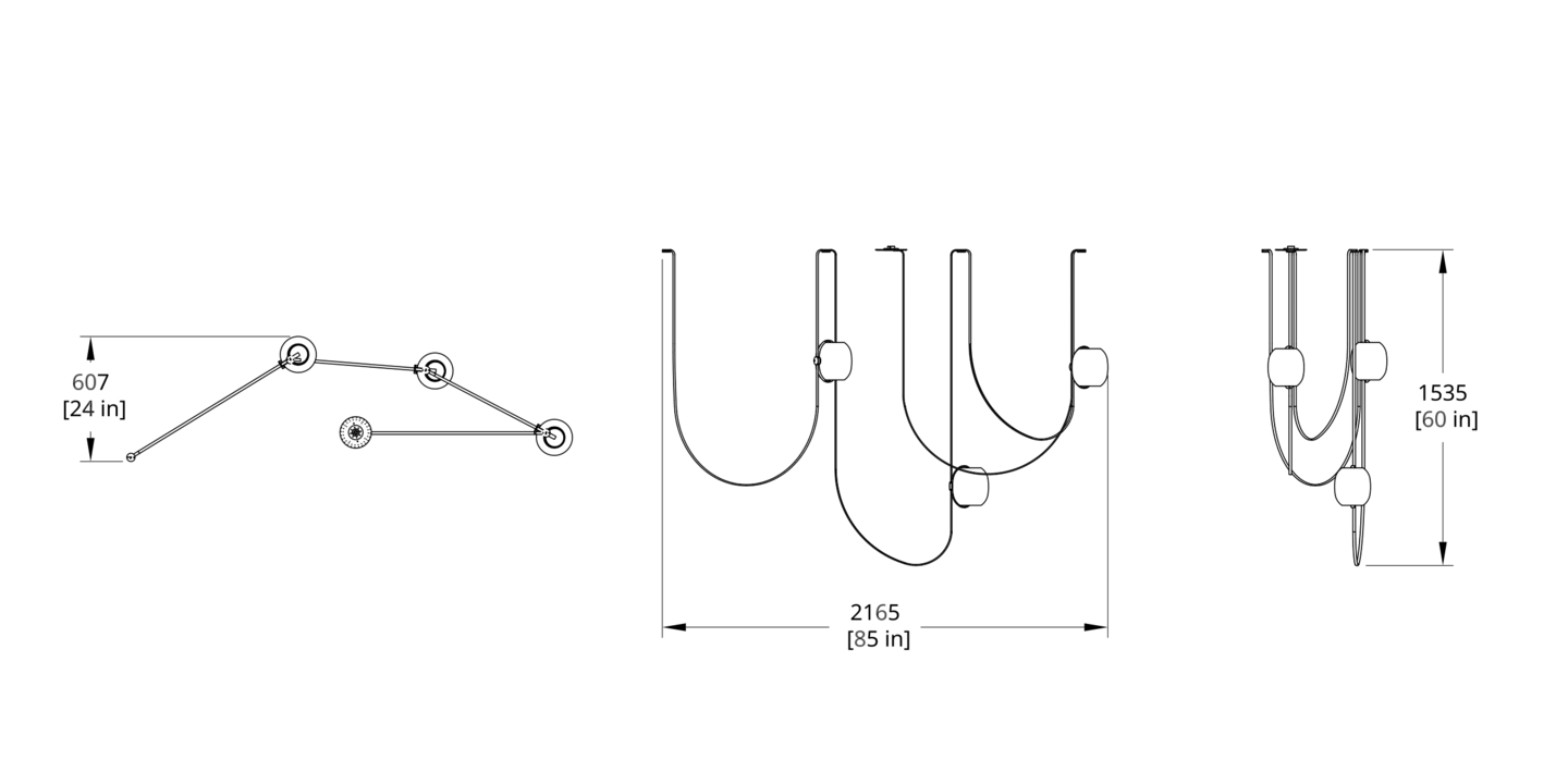 Designed so that no two installations are exactly alike,\xA0Vitis, is a draped modular statement chandelier with customizable possibilities. Its flexible, translucent cables accommodate blown–glass orbs at various heights, giving the appearance of lights floating in space.