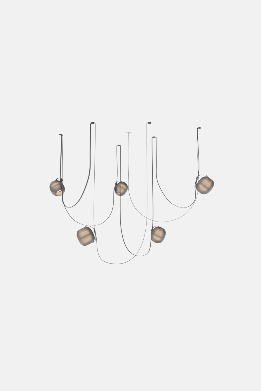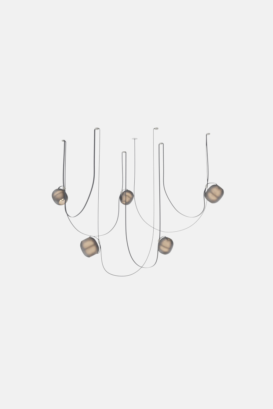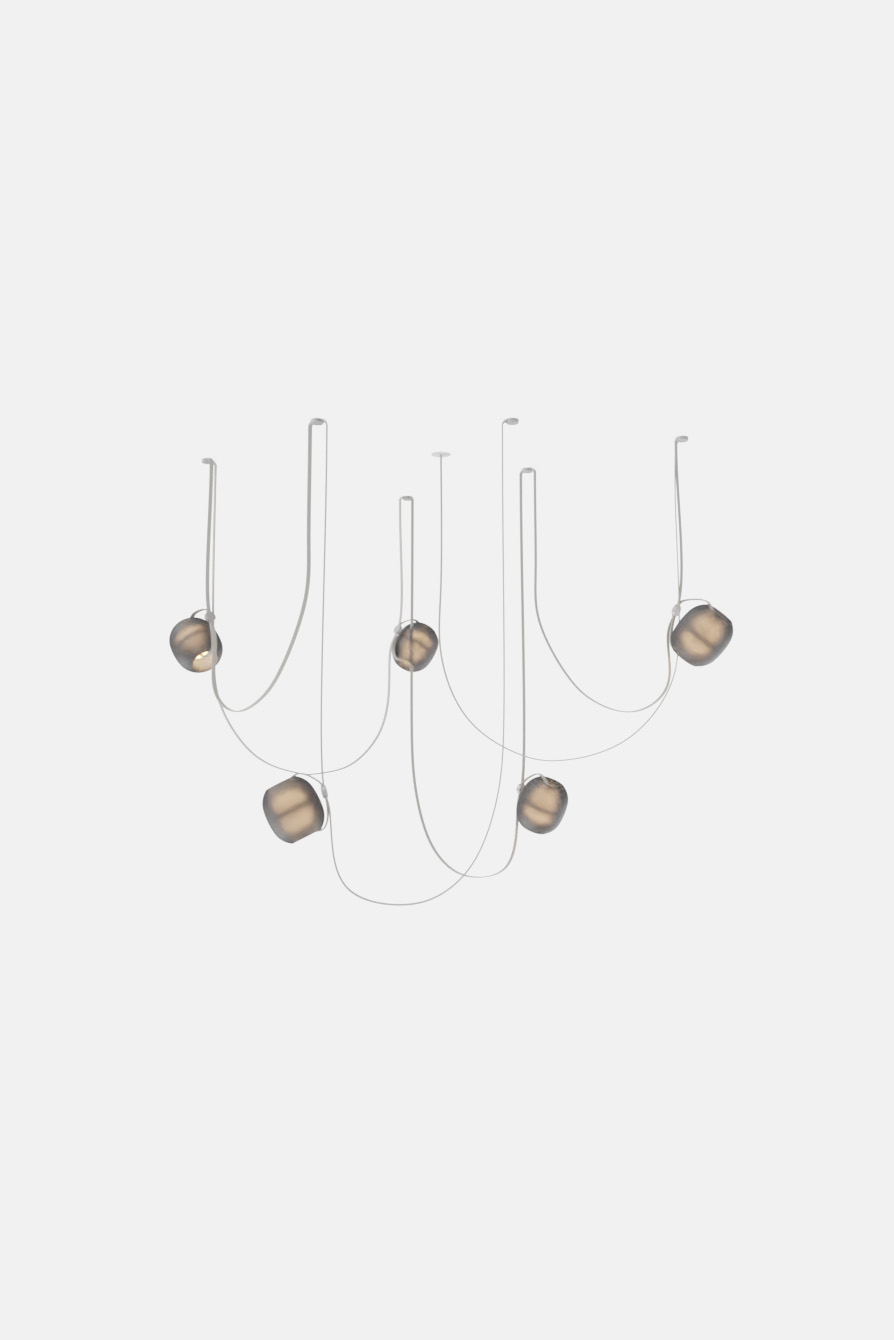 Designed so that no two installations are exactly alike, Vitis, is a draped modular statement chandelier with endless customizable possibilities. Its flexible, translucent cables accommodate 1, 3, 5, or 7 blown-glass orbs at various heights, giving the appearance of lights floating in space. Orbs of smooth matte glass come in an Ivory or Smoke finish with a clear polish interior; a clean sightline through the barrel of the orb reveals a new level of interest to the glowing bead. The draped lines are joined by a radial textured clasp of anodized metal. Vitis includes two canopy options: a standard plate and a recessed trimless option for seamless architectural integration.