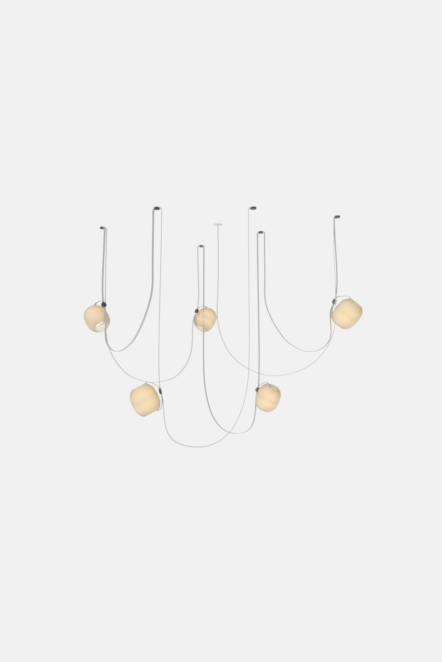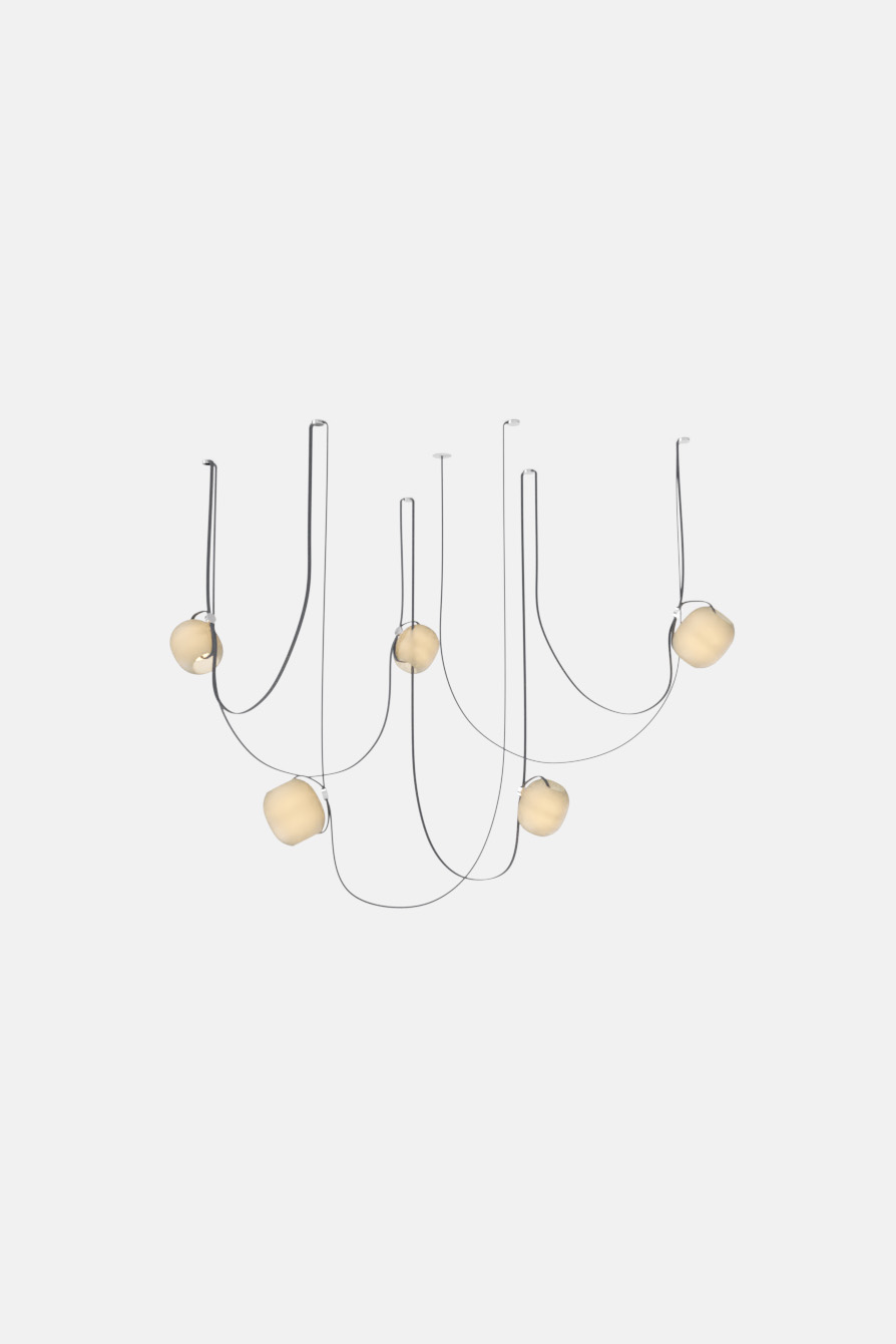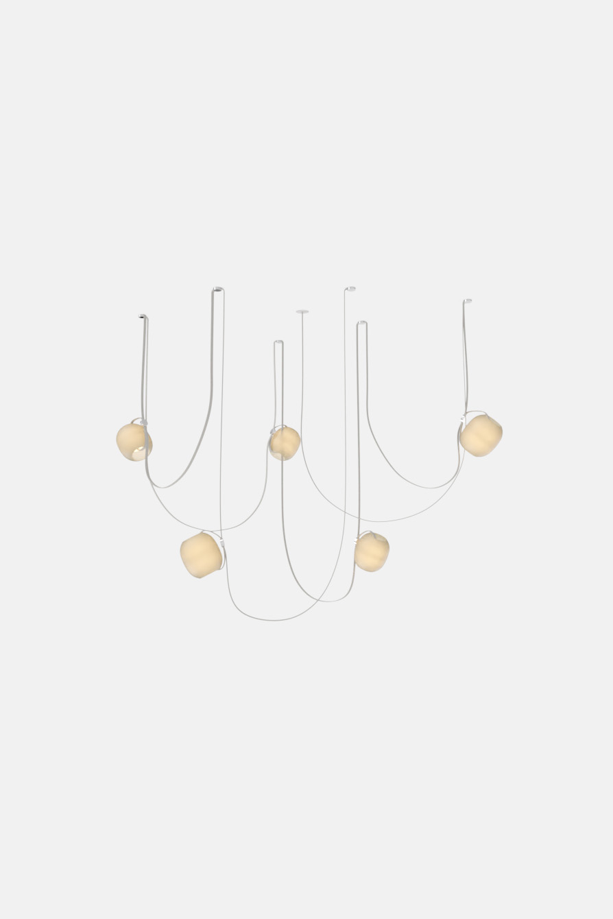 Designed so that no two installations are exactly alike, Vitis, is a draped modular statement chandelier with endless customizable possibilities. Its flexible, translucent cables accommodate 1, 3, 5, or 7 blown-glass orbs at various heights, giving the appearance of lights floating in space. Orbs of smooth matte glass come in an Ivory or Smoke finish with a clear polish interior; a clean sightline through the barrel of the orb reveals a new level of interest to the glowing bead. The draped lines are joined by a radial textured clasp of anodized metal. Vitis includes two canopy options: a standard plate and a recessed trimless option for seamless architectural integration.