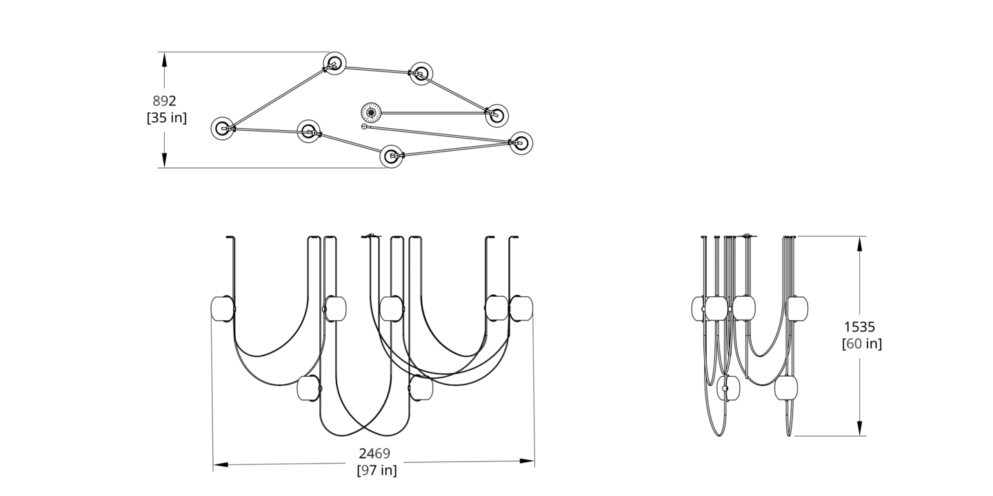 Designed so that no two installations are exactly alike,\xA0Vitis, is a draped modular statement chandelier with customizable possibilities. Its flexible, translucent cables accommodate blown–glass orbs at various heights, giving the appearance of lights floating in space.